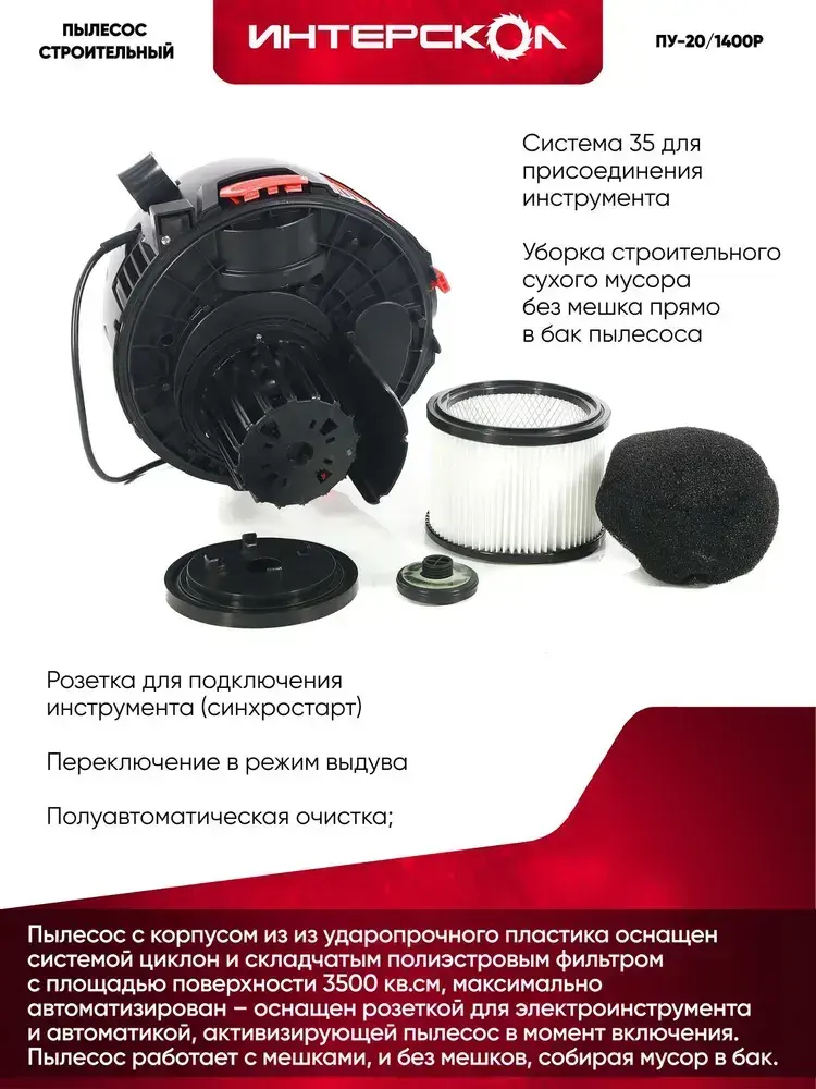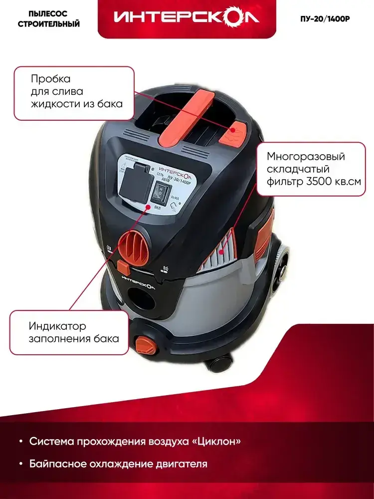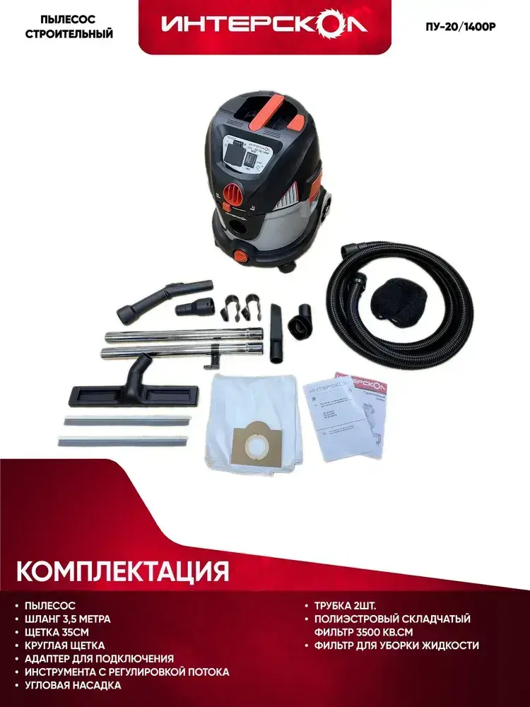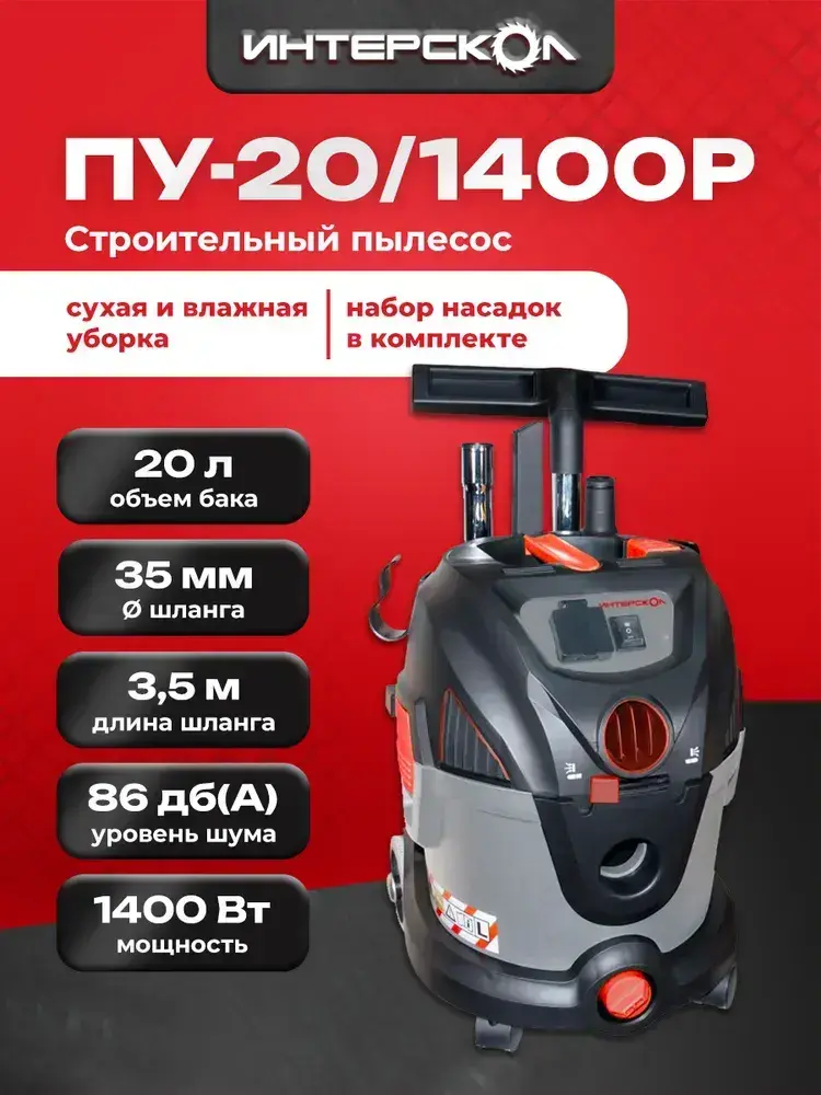 Пылесос строительный ИНТЕРСКОЛ ПУ-20/1400Р (706.1.0.00)