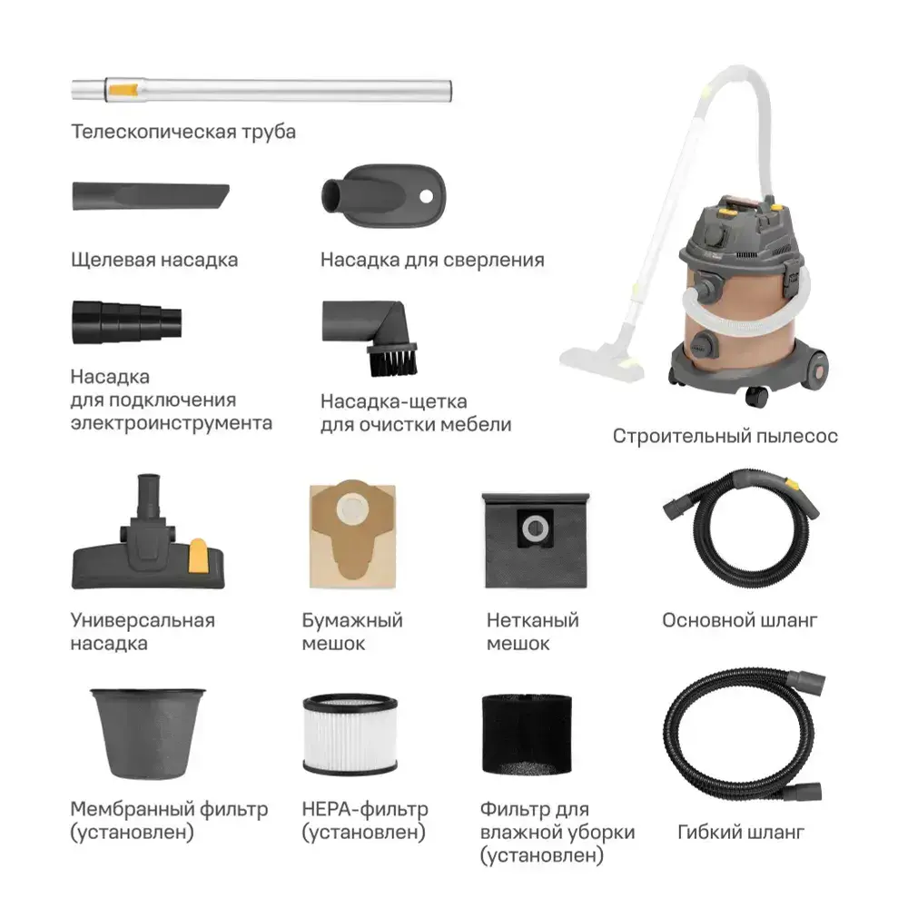 Пылесос строительный Nocord NVE-1600.20.S, 1600 Вт, 20 л, шланг 2+2 м, автоматическая розетка