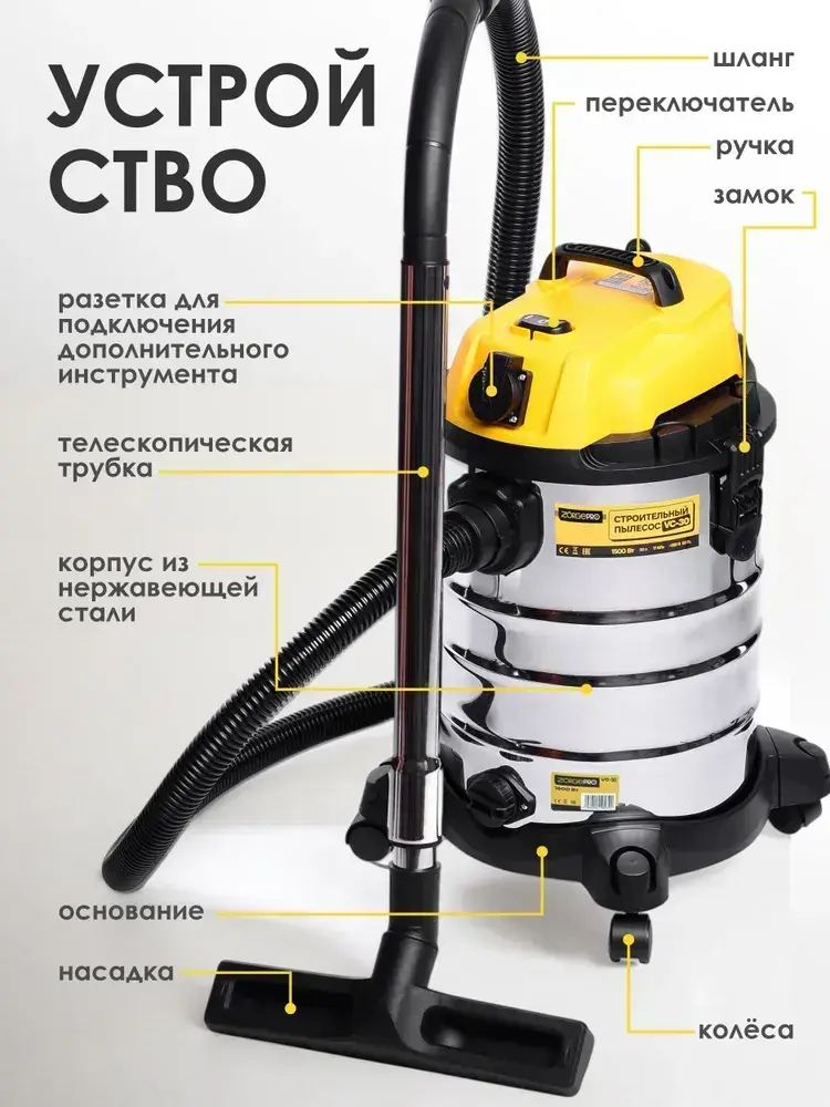 Пылесос строительный / промышленный ZORGEPRO ZVC-30( 1500 Вт, 30 литров, Шланг 3 М, НЕРА фильтр, сухая/влажная уборка )