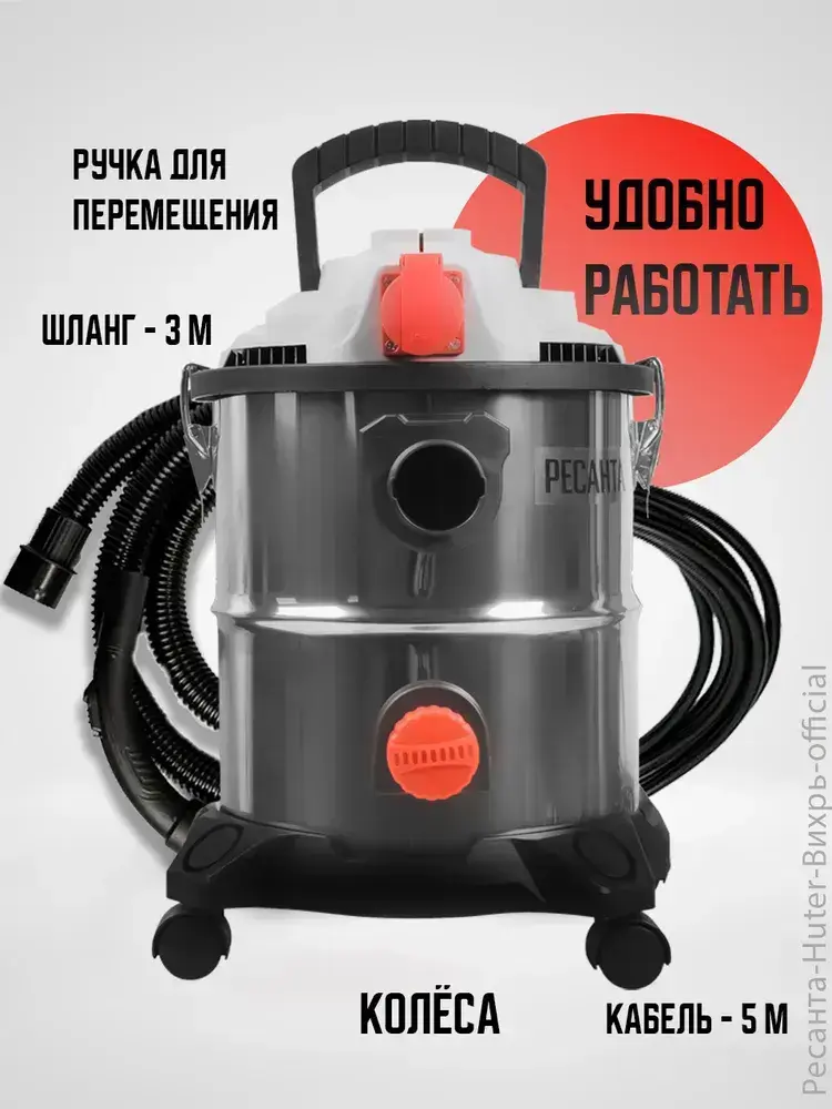 Пылесос строительный Ресанта ПС-1500/20 с розеткой, выдувание и сбор воды