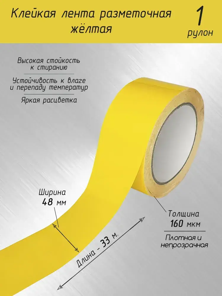 Разметочная клейкая лента / Скотч для маркировки пола жёлтый 33 метра