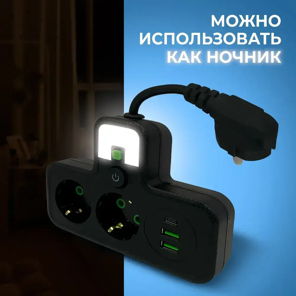 Разветвитель электрический, черный, 2 розетки, 2 USB, 1Type-C гибкий провод
