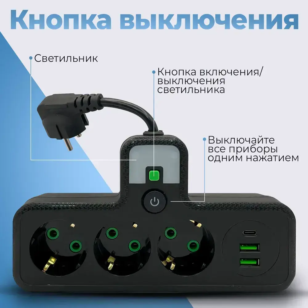 Разветвитель электрический, черный, 3 розетки, 2 USB, 1Type-C
