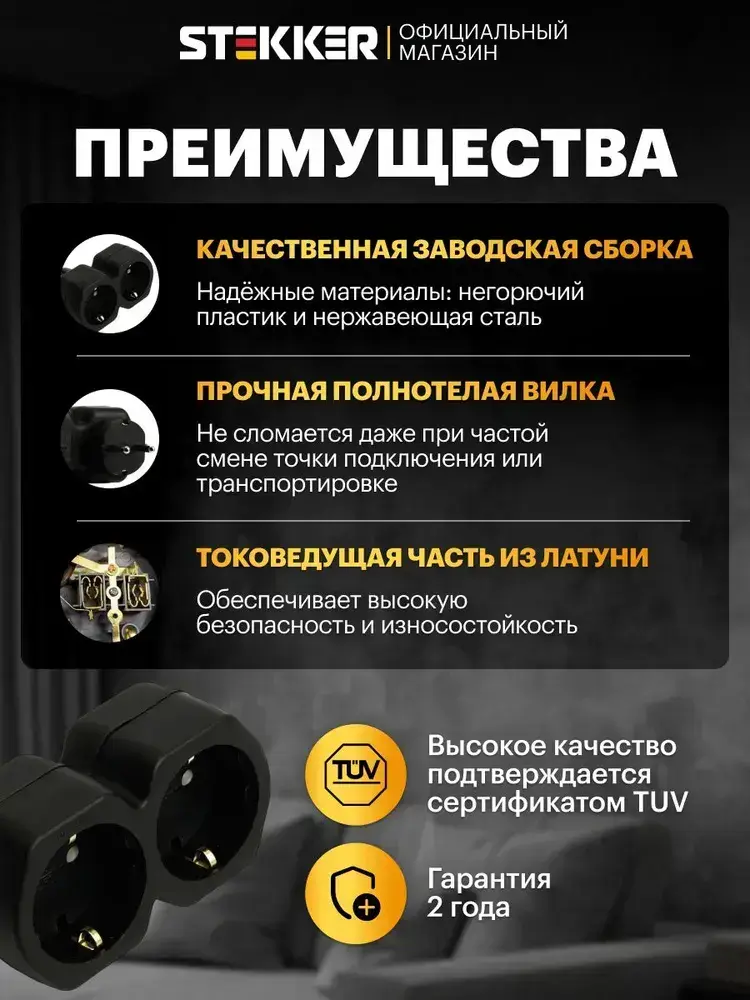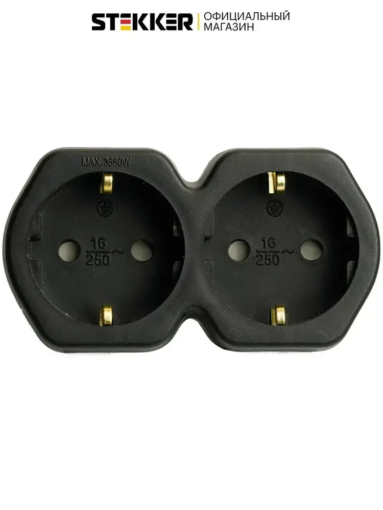 Разветвитель сетевой 2-местный с/з 250V,16A, ABS огнеустойчивый пластик, черный Stekker ADP16-12-21 50107