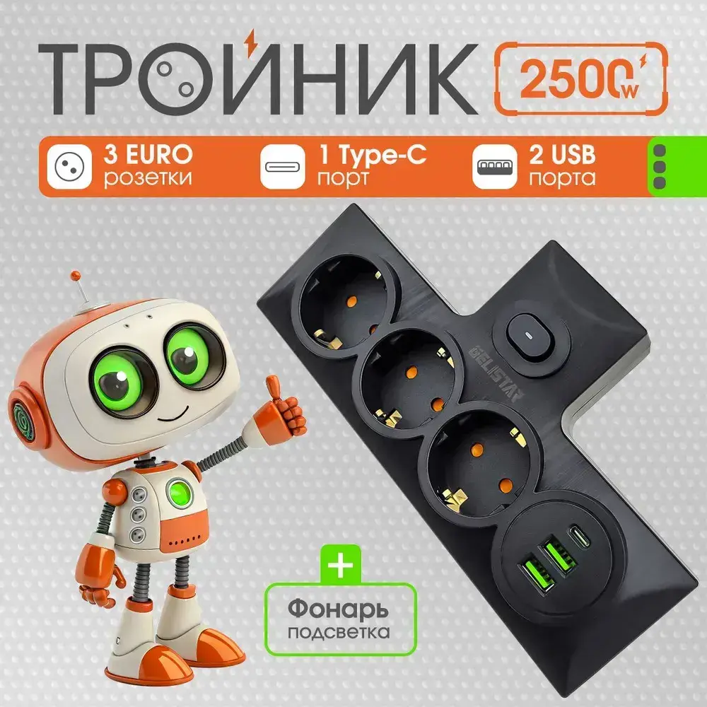 Разветвитель сетевой с тремя гнездами ЕВРО, тройник, адаптер черный /2 USB порта/Type-C порт