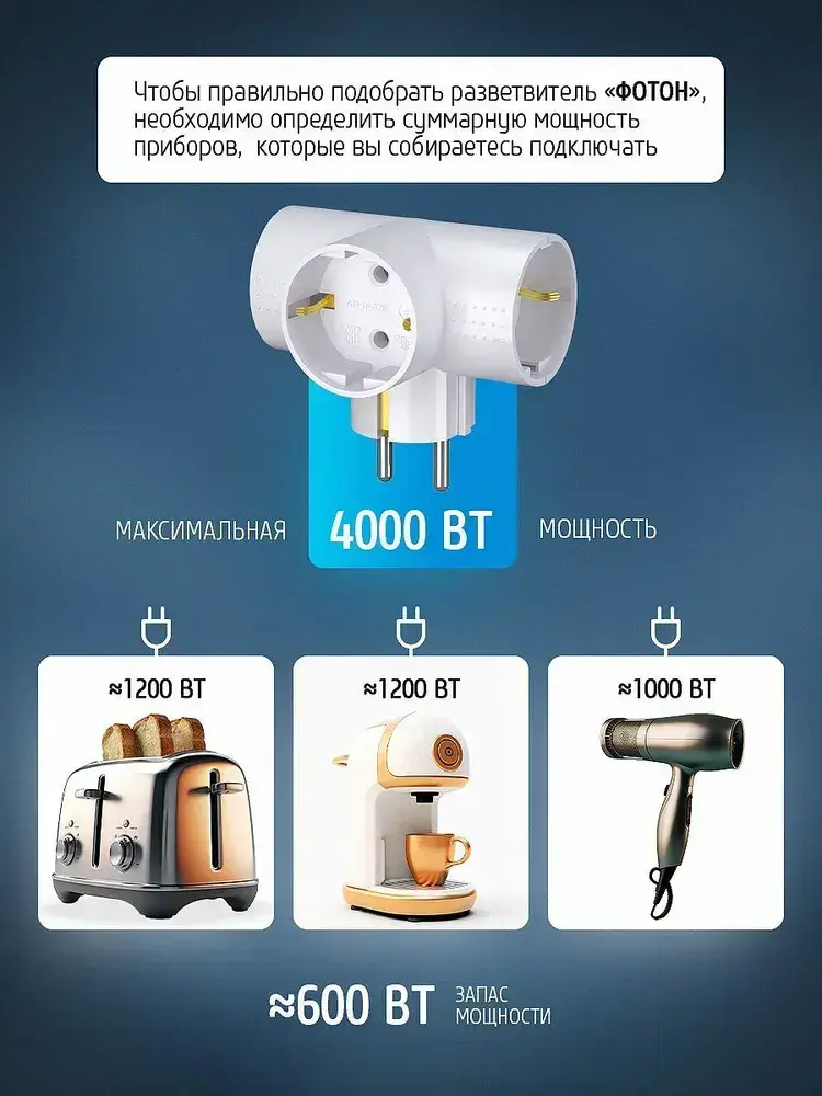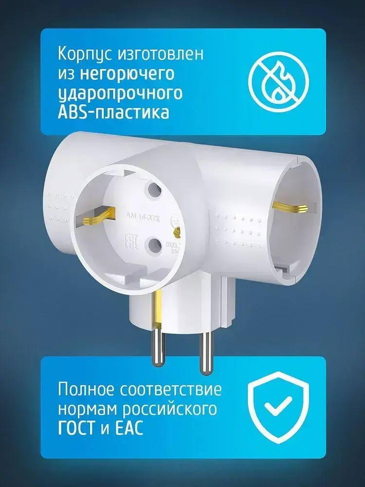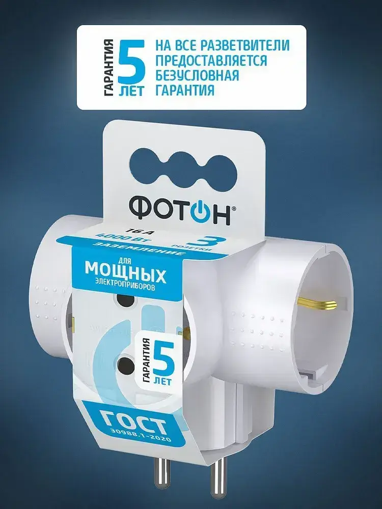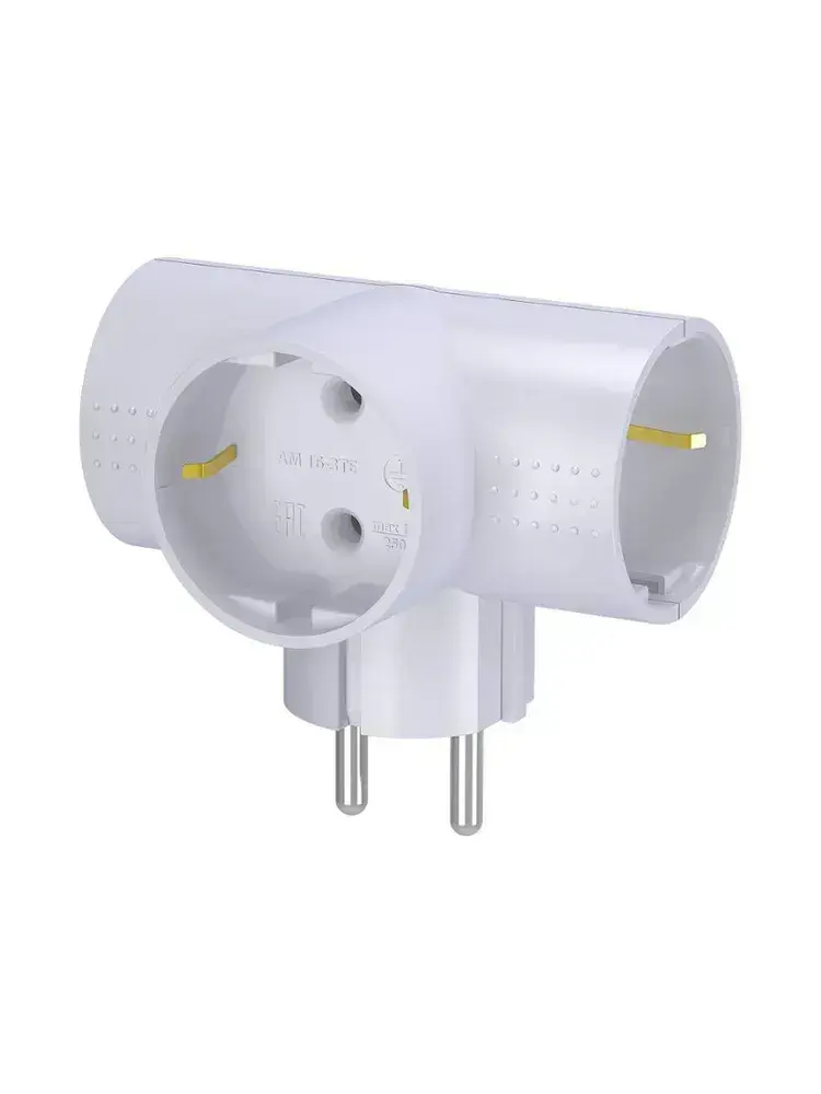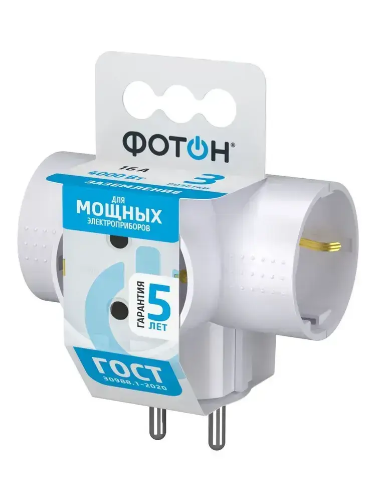 Разветвитель тройник для розетки ФОТОН, Т-образный 16А с заземлением