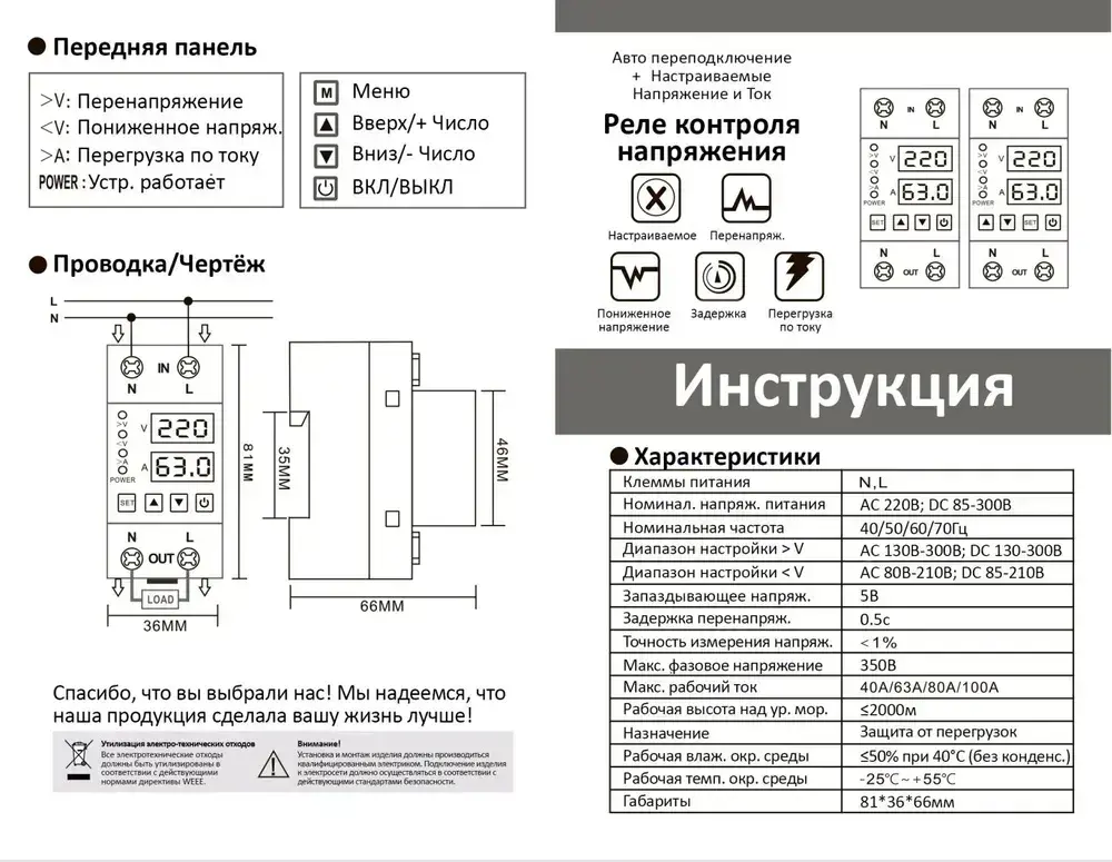 Реле контроля напряжения на DIN-рейку, 40A 220В