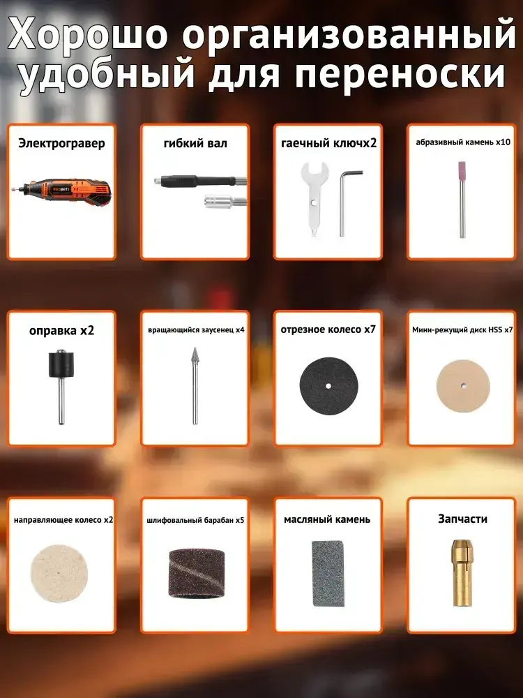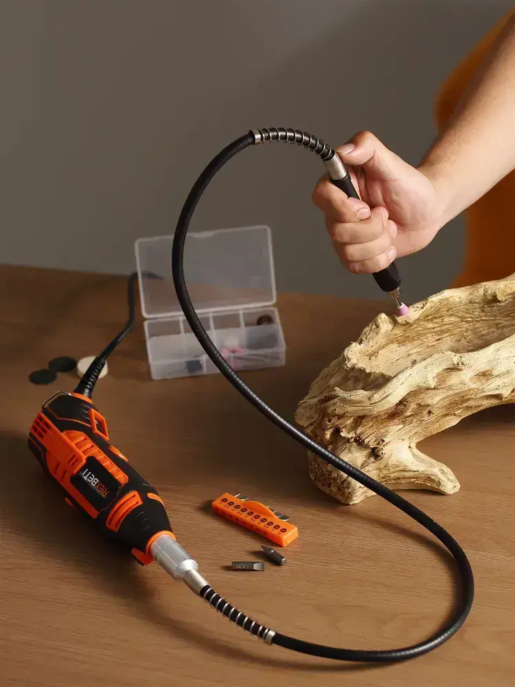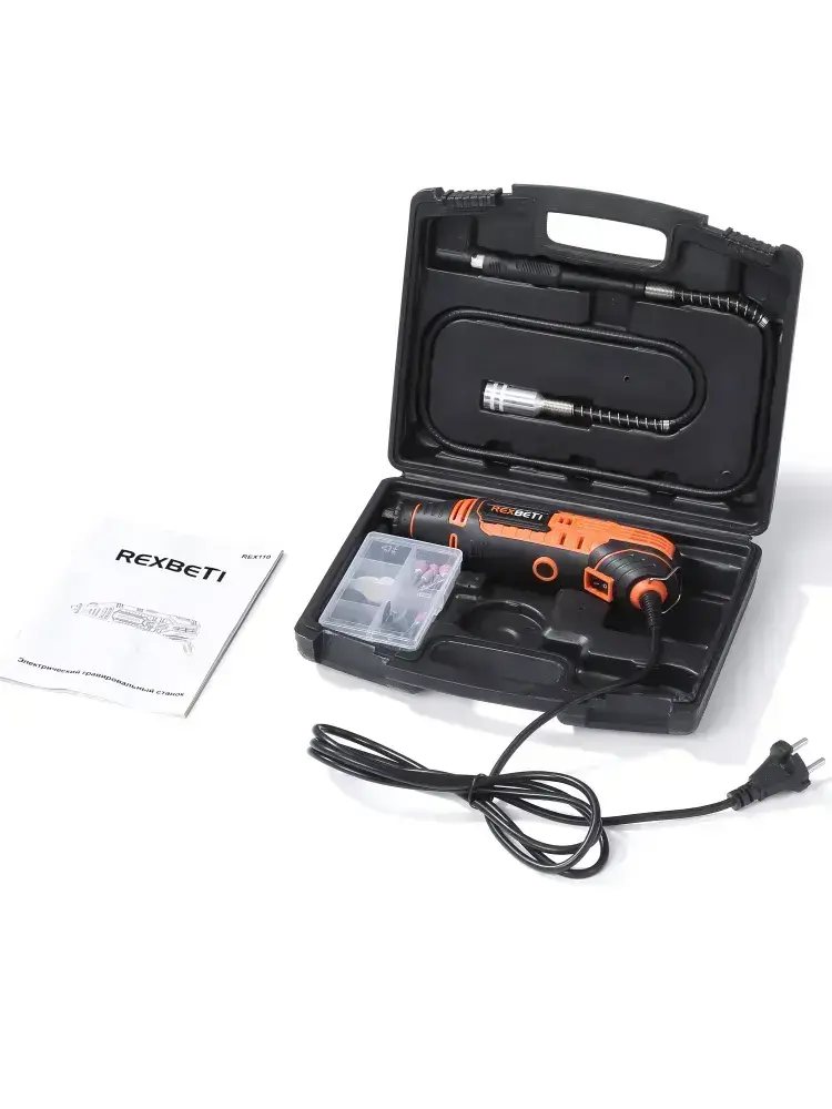 REXBETI Электрический гравер, Электрогравер с гибким валом для шлифовки( 200 Вт, 33000 об/мин, 40 шт насадок, регулировка скорости, Защитная коробка)