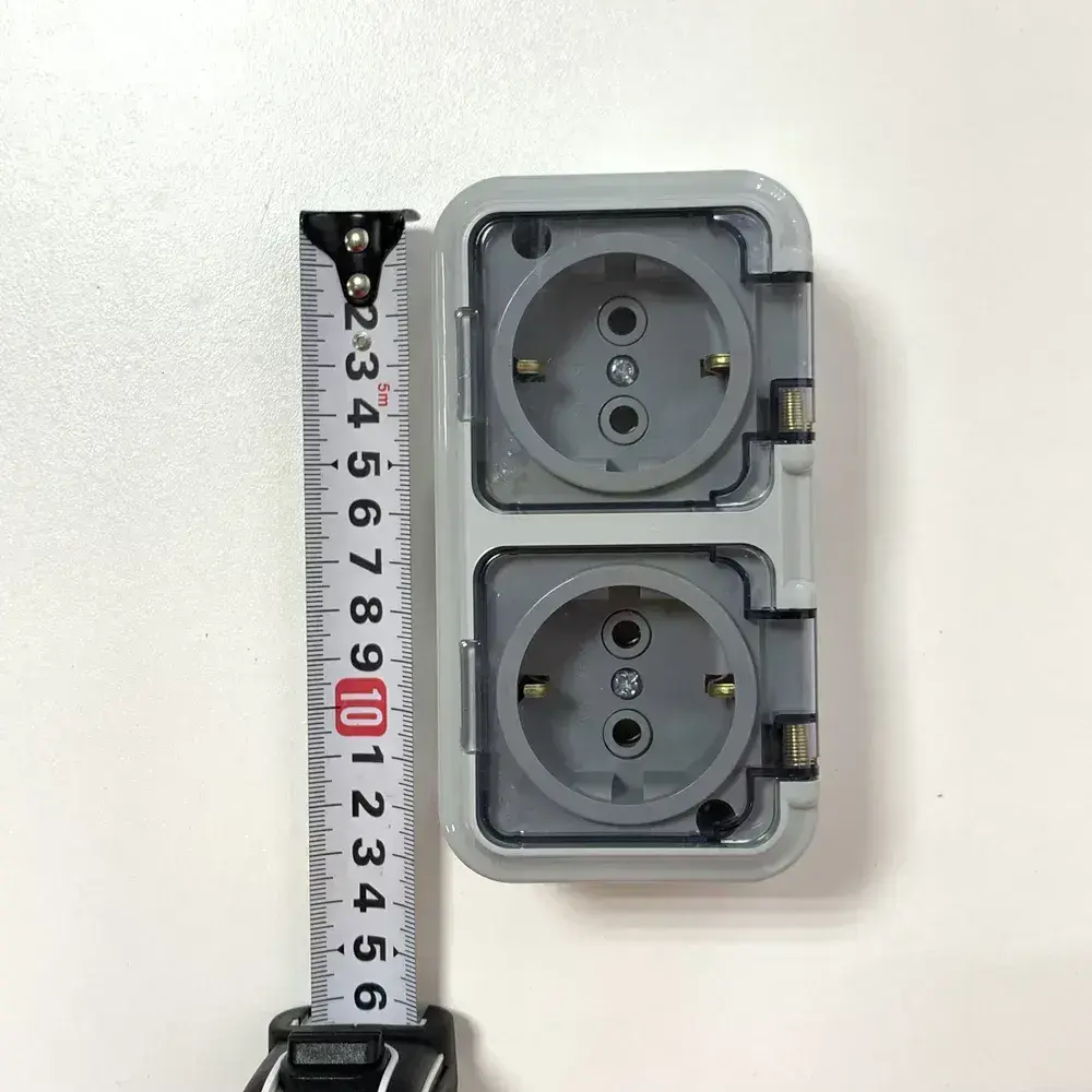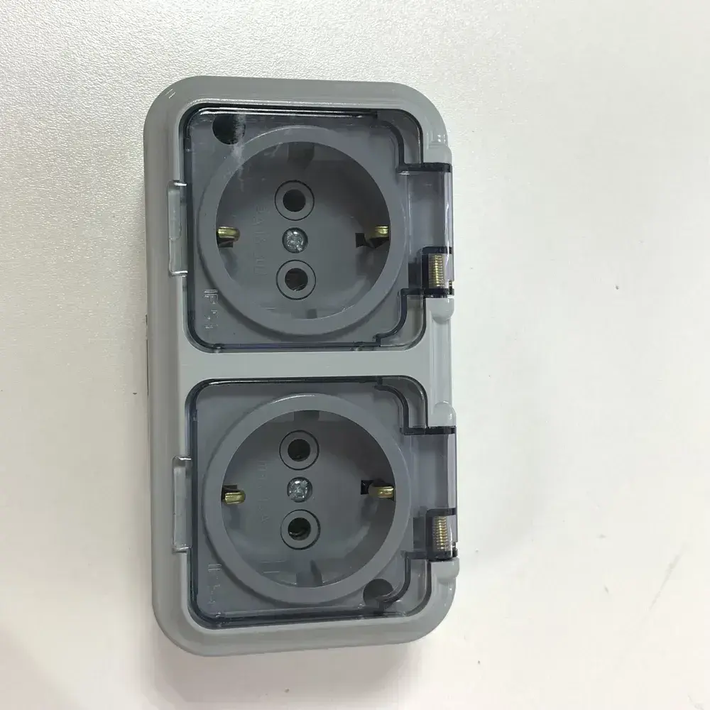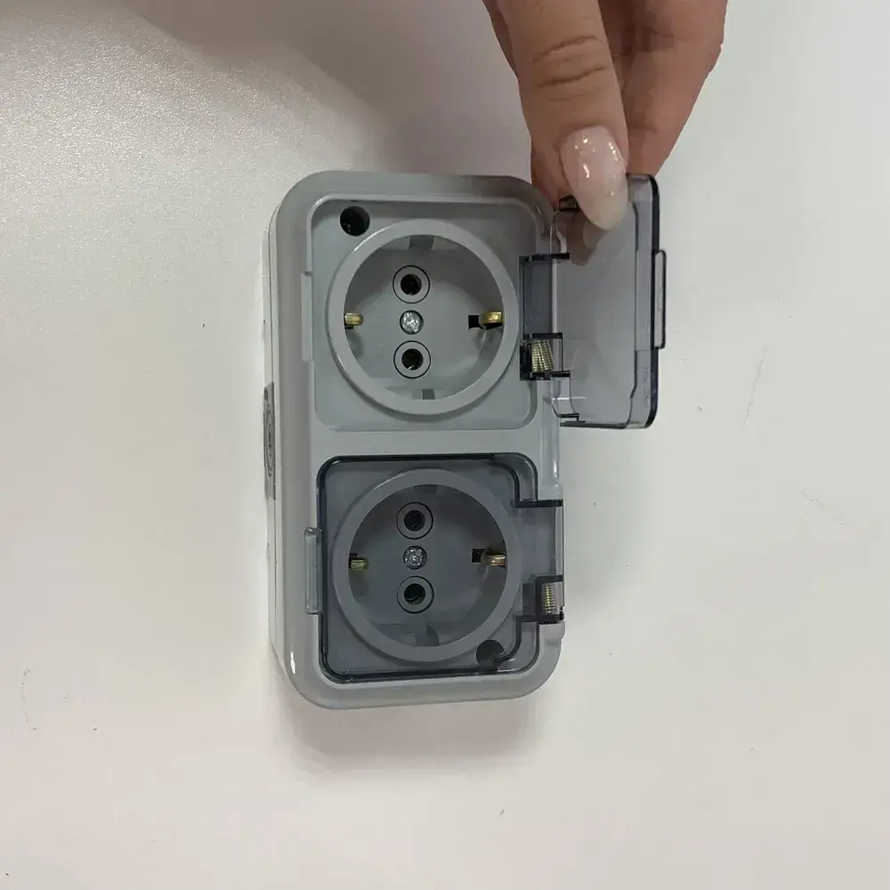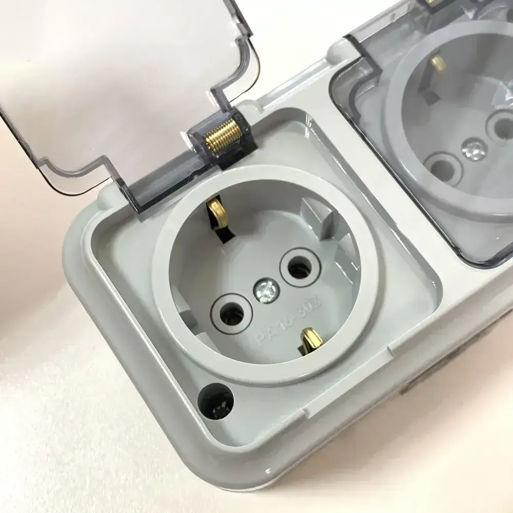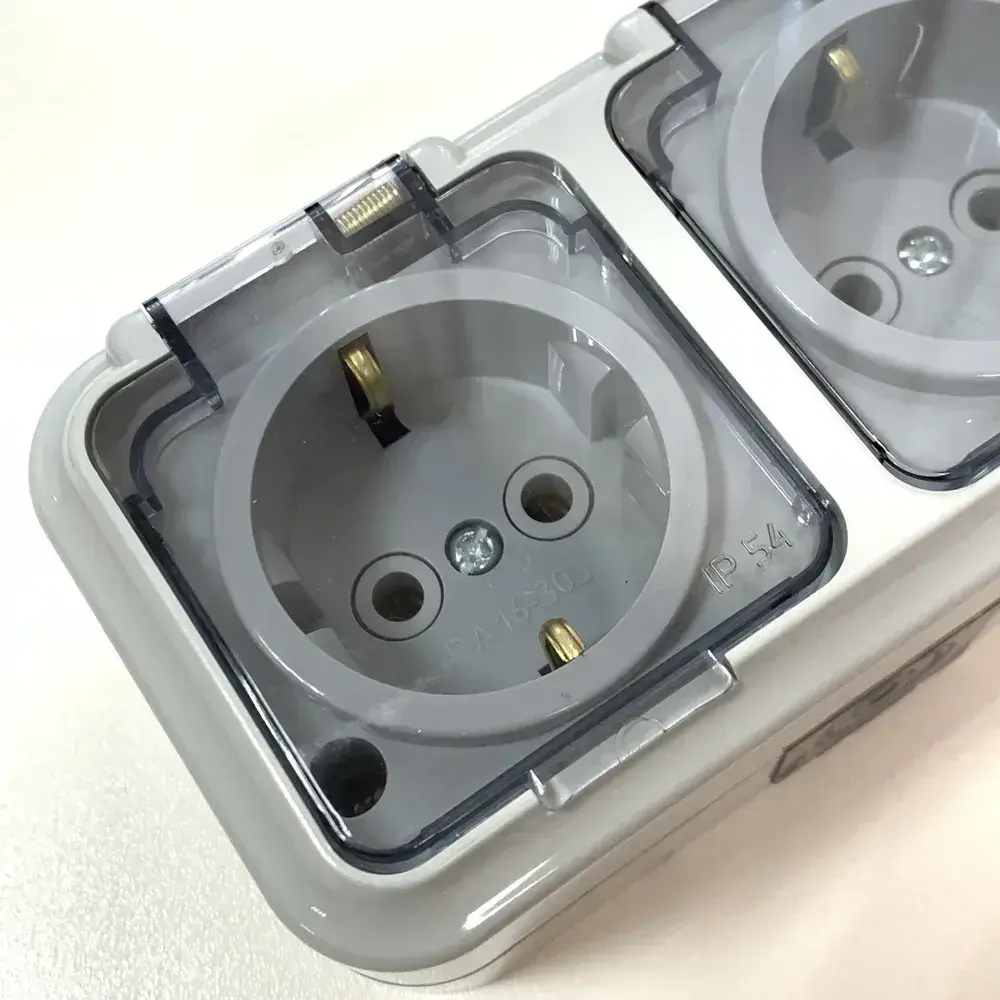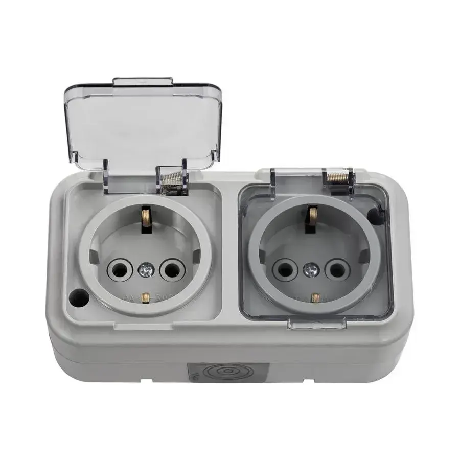 Розетка двухместная, уличная, влагозащищенная, открытой установки 16А, IP54 с заземлением, серия ПР, с прозрачной крышкой