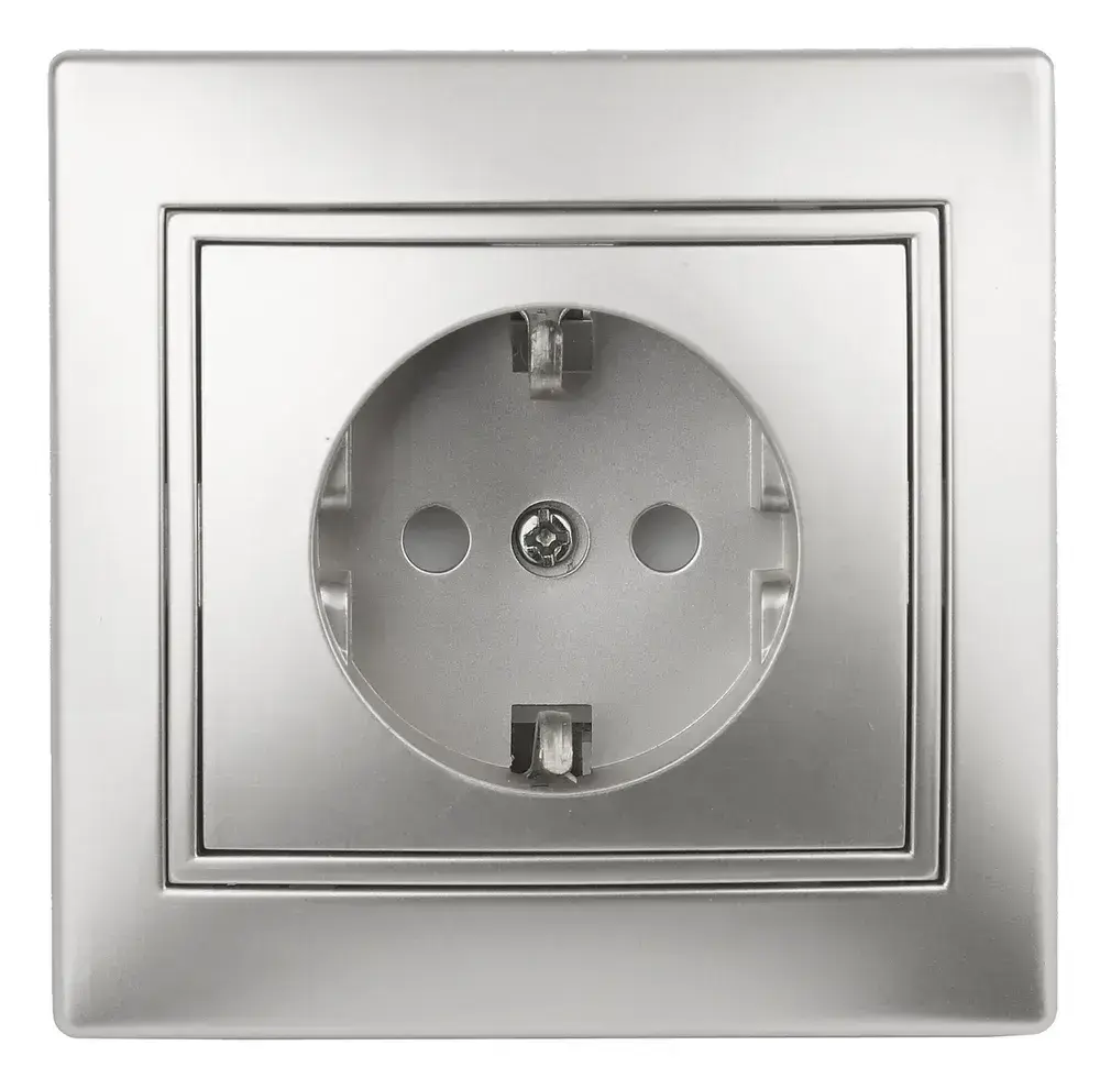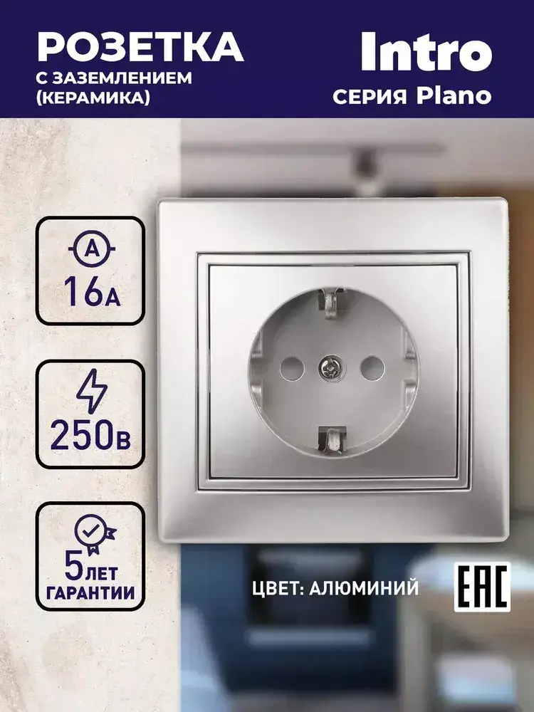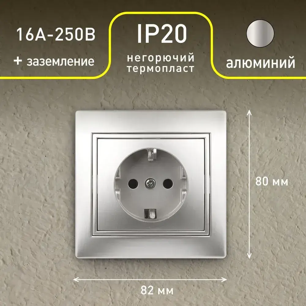 Розетка Intro Plano 1-202-03 с заземлением 2P+E Schuko 16А-250В IP20 скрытой установки алюминий