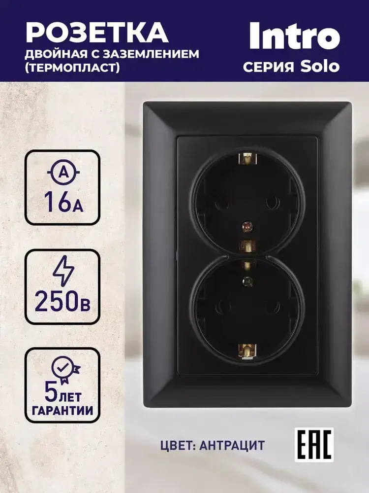 Розетка Intro Solo 4-205-05 с заземлением двойная 2X2P+E Schuko 16А-250В IP20 скрытой установки черный