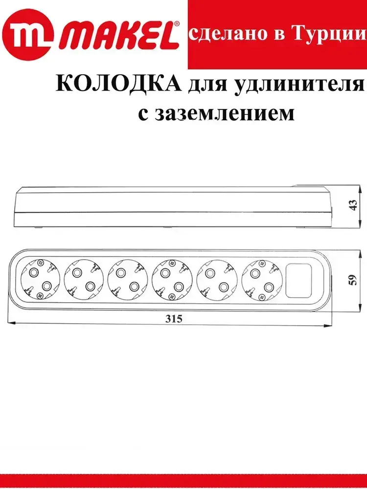 Розетка (колодка для удлинителя) 6 гнезд с заземлением, черная Makel электрическая, переносная, разборная,.