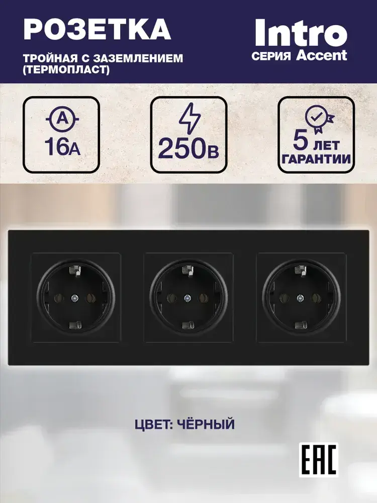 Розетка тройная с заземлением Intro Accent чёрный
