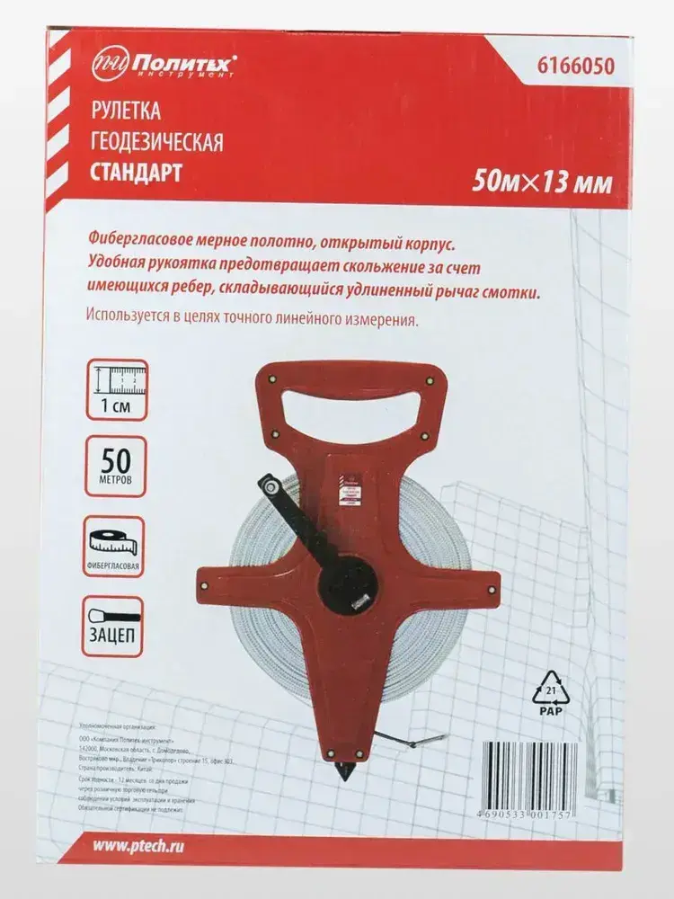 Рулетка геодезическая 50 м 13 мм с фибергласной лентой
