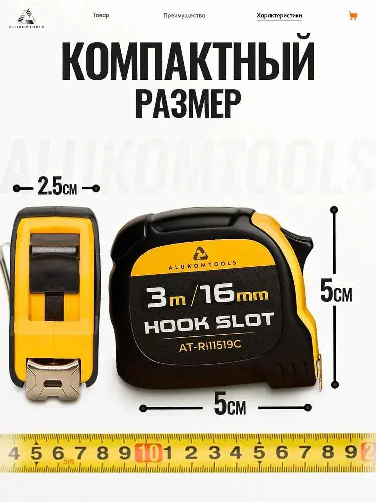 Рулетка строительная, 3 м х 16 мм, две кнопки фиксации