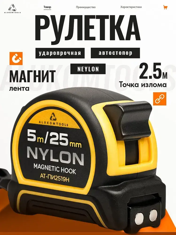Рулетка строительная с автостопом, 5 м х 25 мм, нейлоновое покрытие, магнитный зацеп