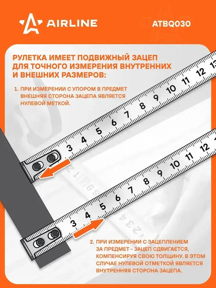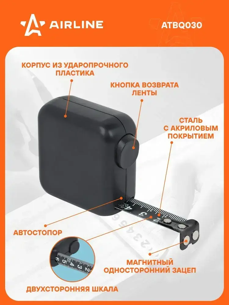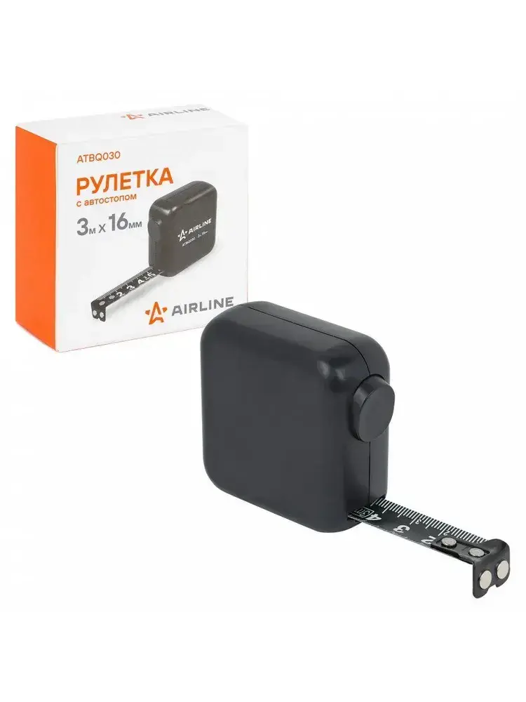 Рулетка в ударопрочном корпусе 3мх16мм, автостоп, магнитный зацеп, двуст. шкала AIRLINE ATBQ030