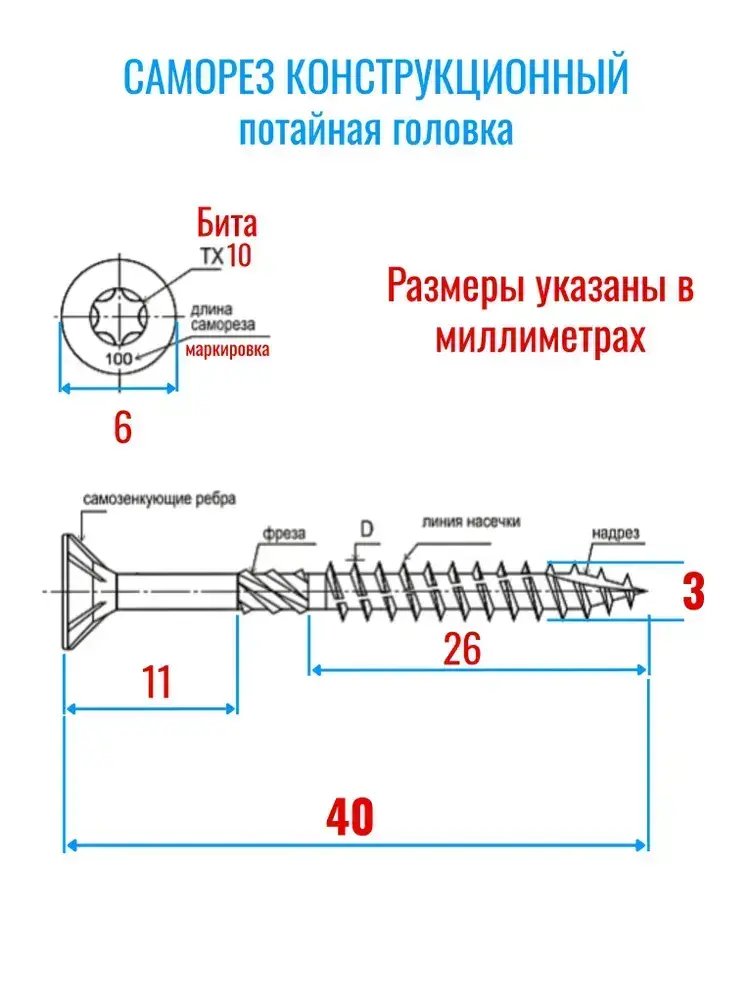 Саморез конструкционный по дереву 3 х 40 потай Torx 10 (250шт)