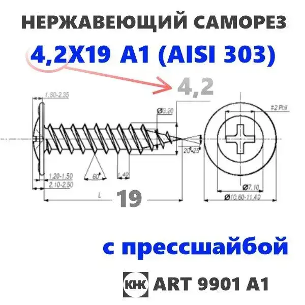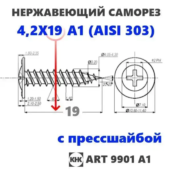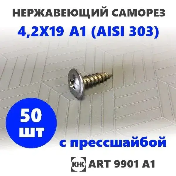 Саморез нержавеющий 4,2х19 с прессшайбой остроконечный КНК, нерж сталь, клоп Li, 50 шт.