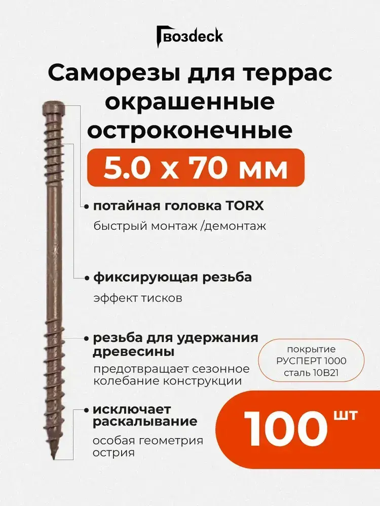 Саморез по дереву Gwozdeck для Террасной доски Потайной 5,0*70 Окрашенный Остроконечный Torx15 Упаковка 100 шт., подходит для ДЖЕТ 90