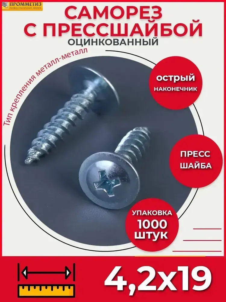 Саморез СММ 4,2х19 мм (упаковка 1000 шт.) острый с прессшайбой по металлу, для профиля и забора. Промметиз.