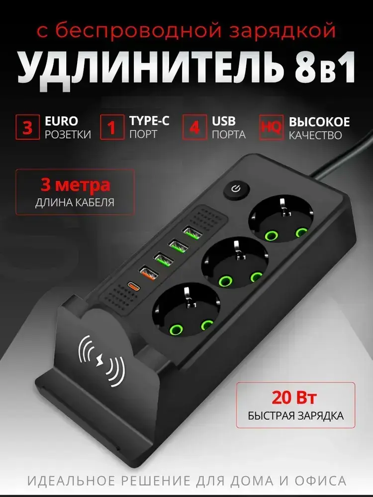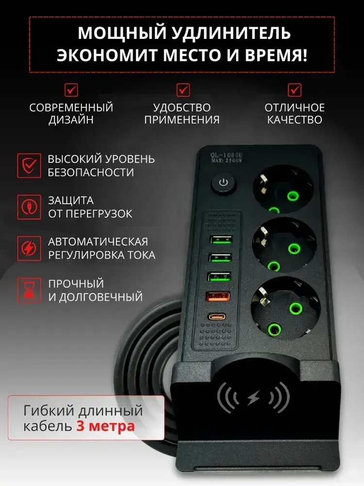 Сетевой фильтр 3 метра Удлинитель с USB и Type-c