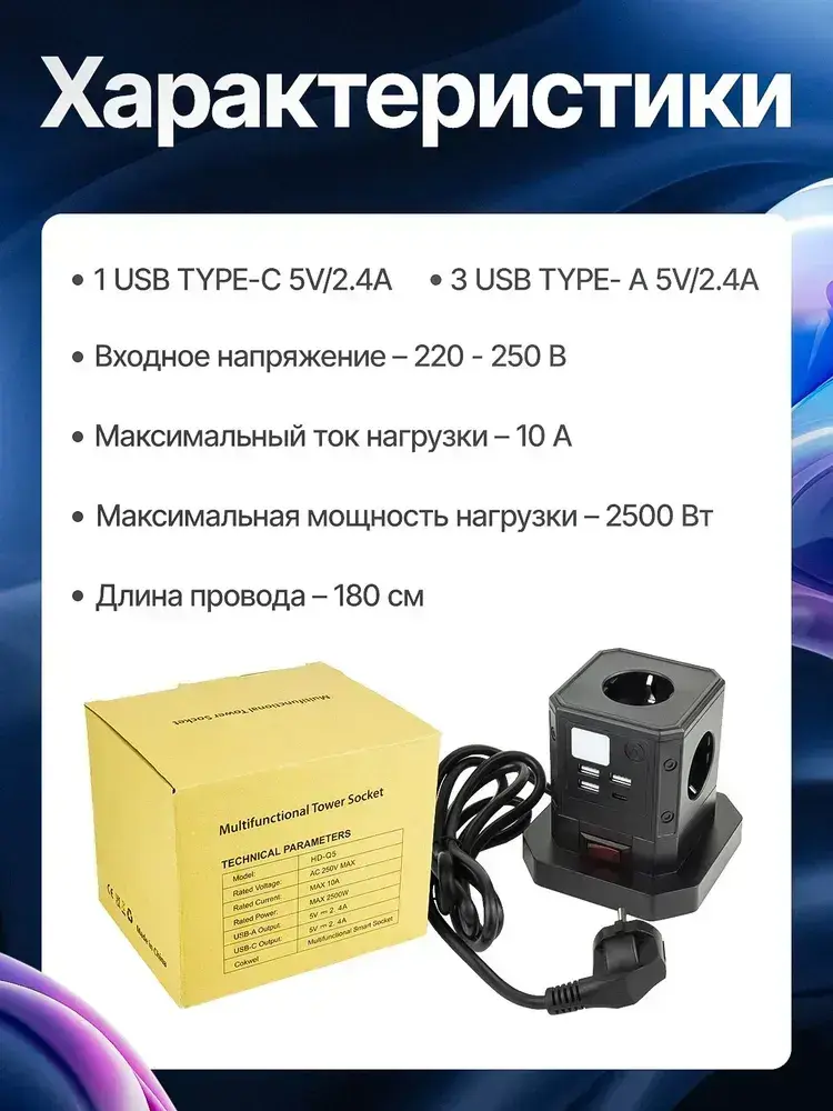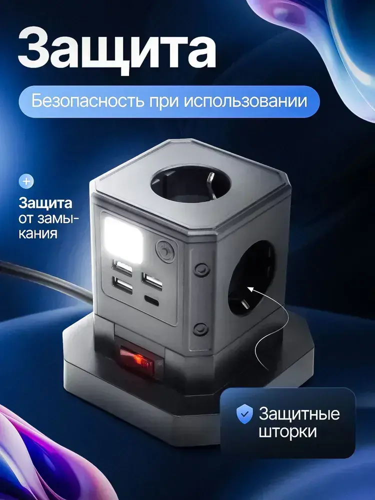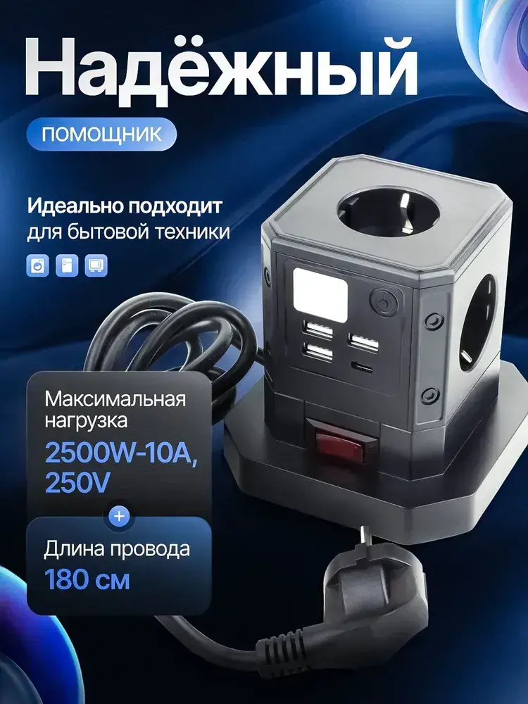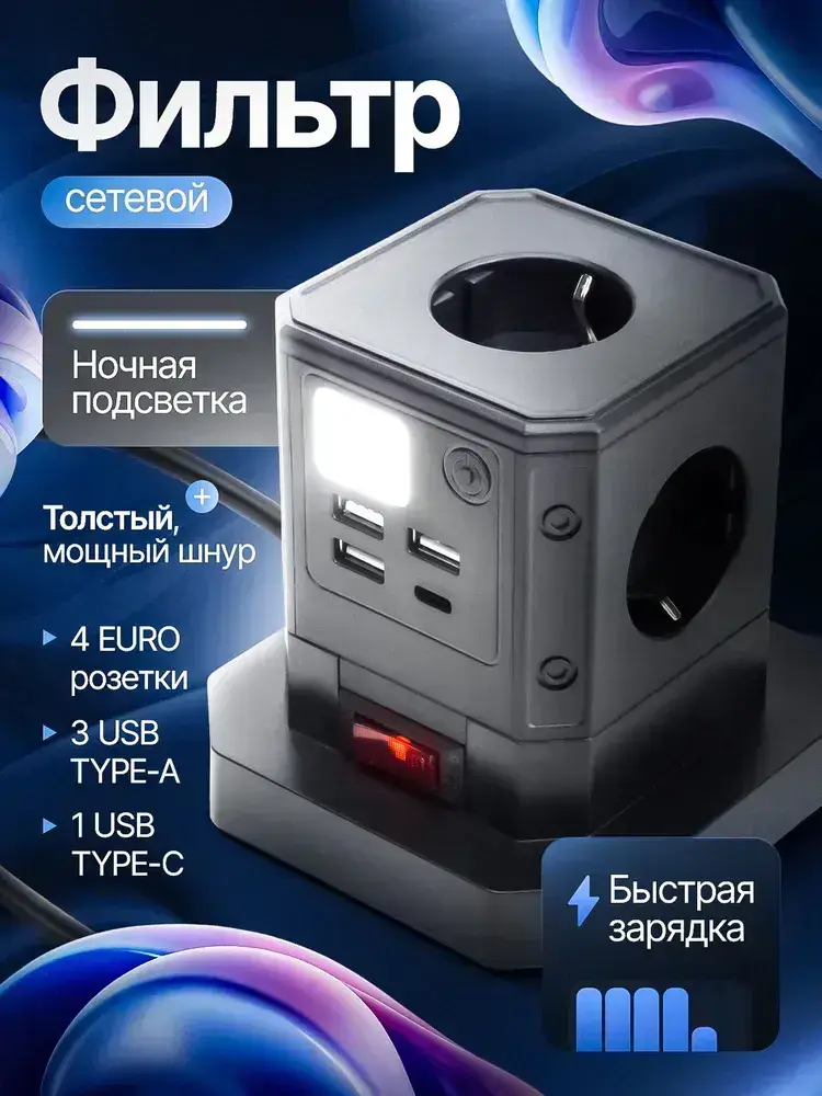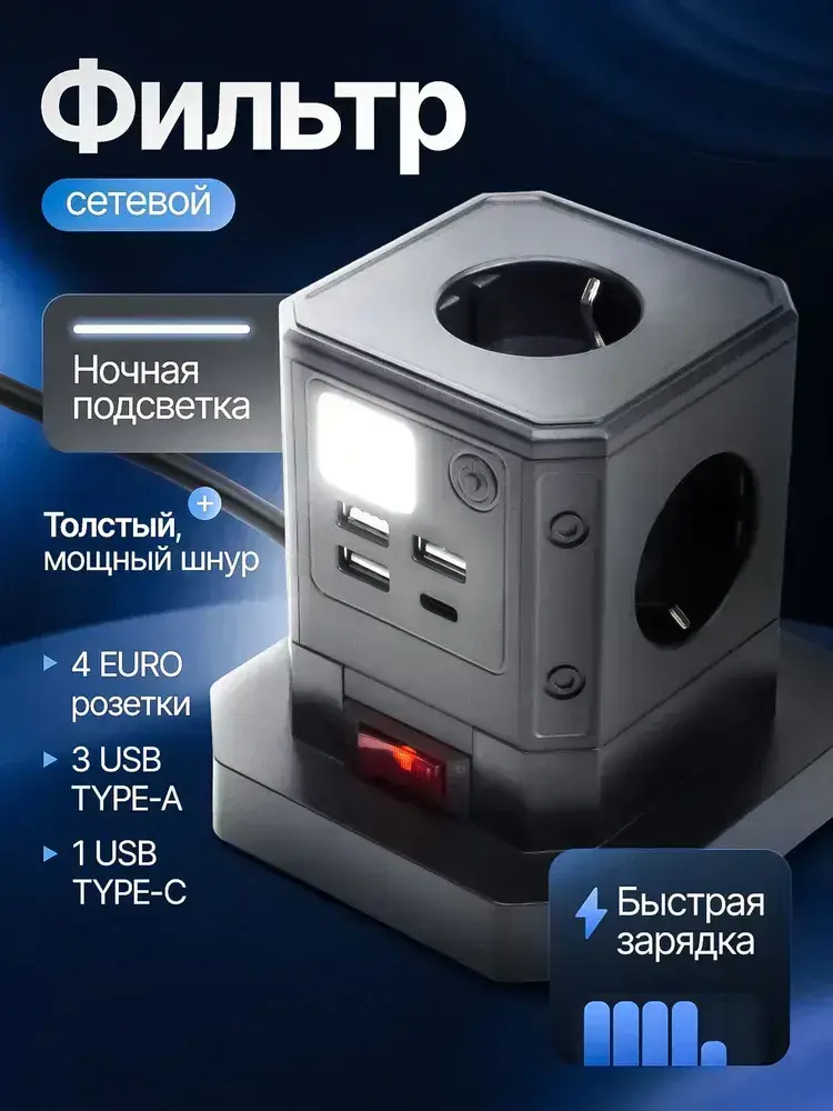 Сетевой фильтр 4 розетки, 3 USB, 1 Type-C, удлинитель с заземлением, предохранителем, ночной подсветкой, защита от перенапряжения