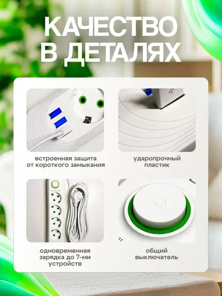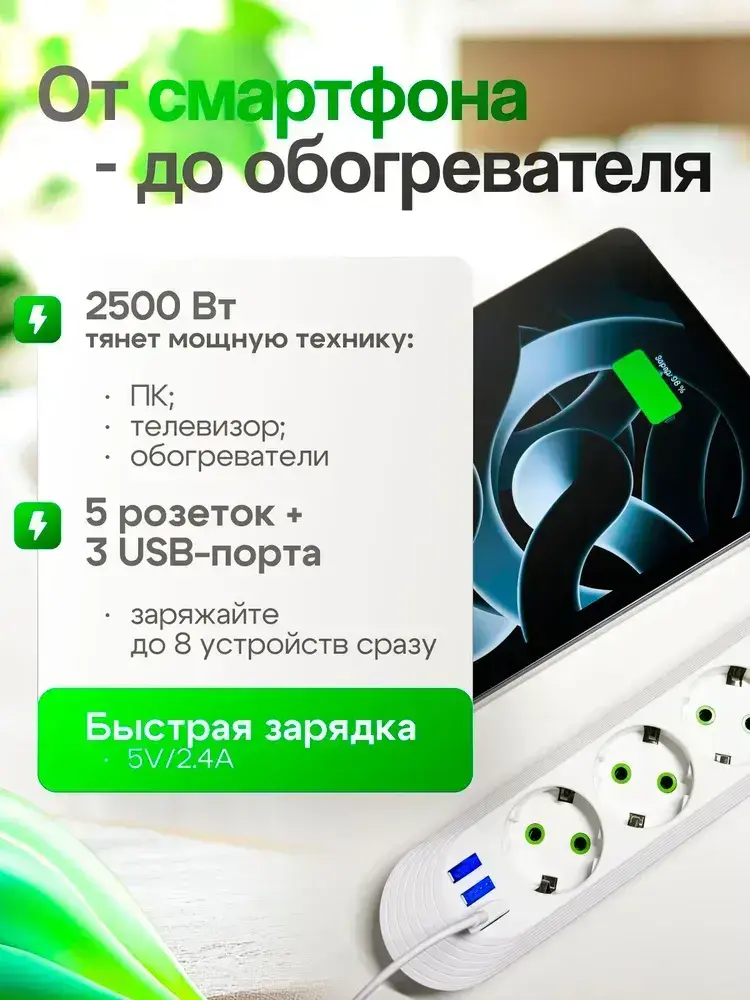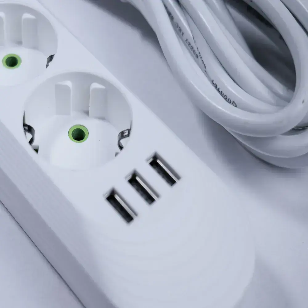 Сетевой фильтр 4 розетки, пилот, удлинитель, разветвитель, 4 USB, длина провода 5 метров, белый