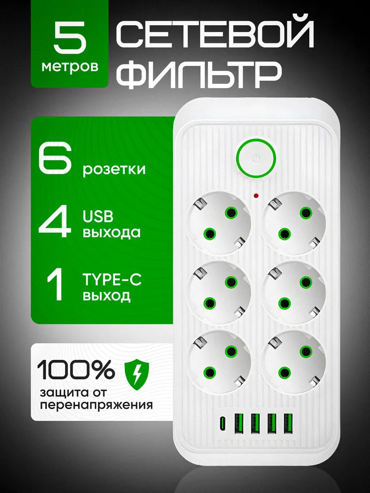 Сетевой фильтр 5 метров, на 6 розеток, удлинитель с usb пилот с type-c белый