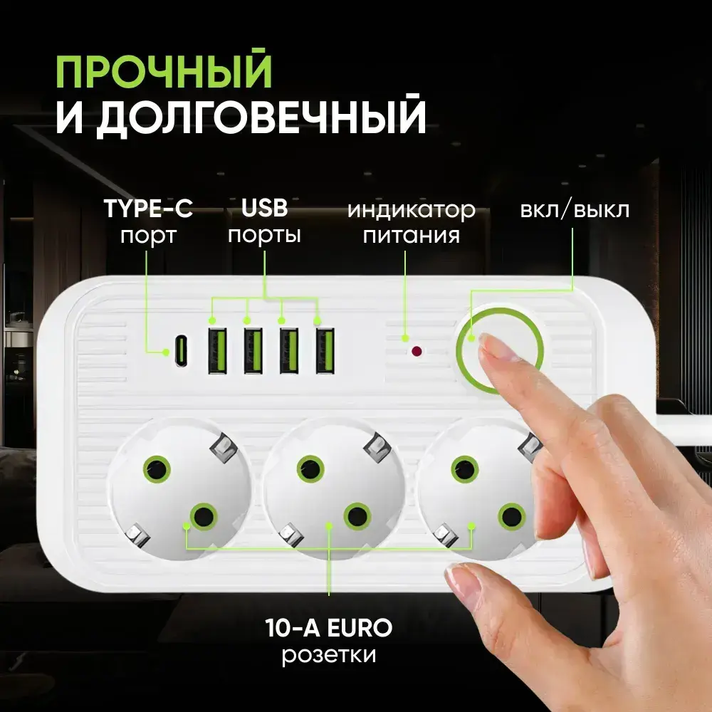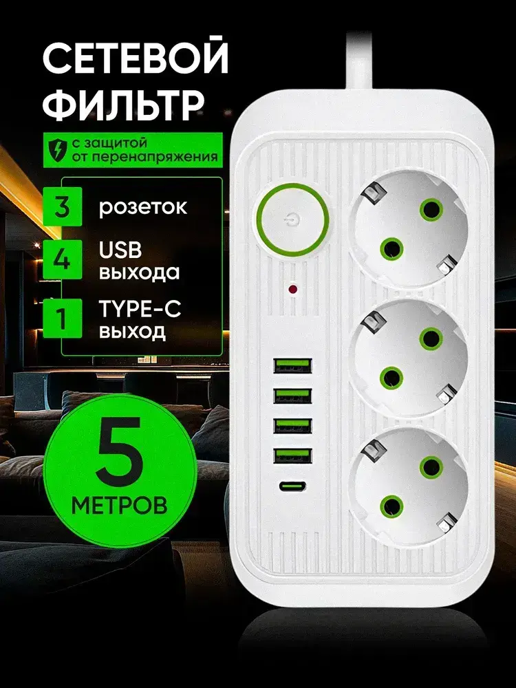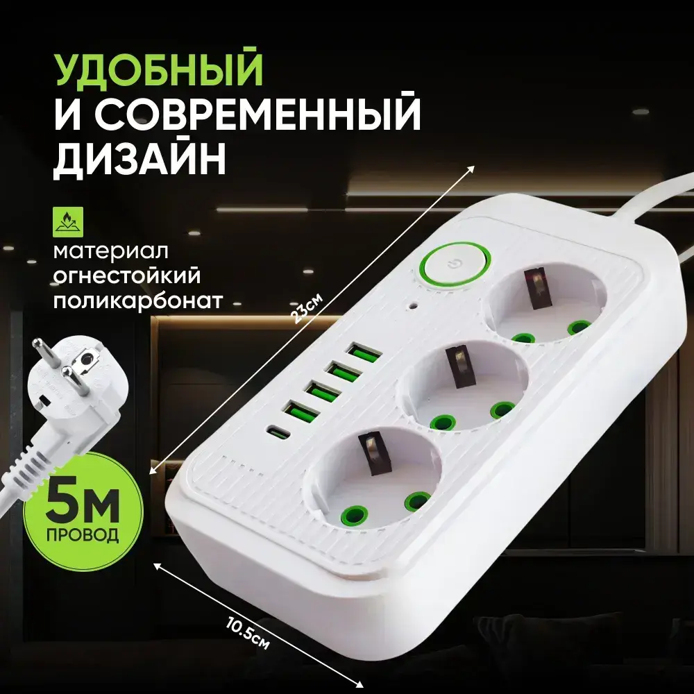 Сетевой фильтр 5м, удлинитель с usb пилот с type-c белый