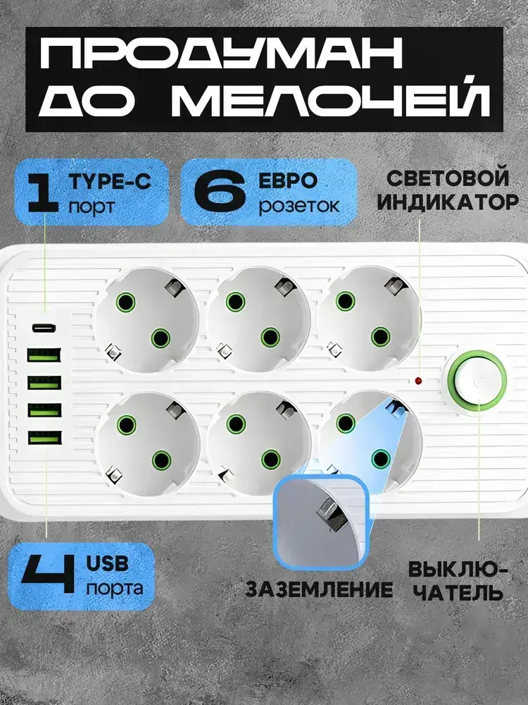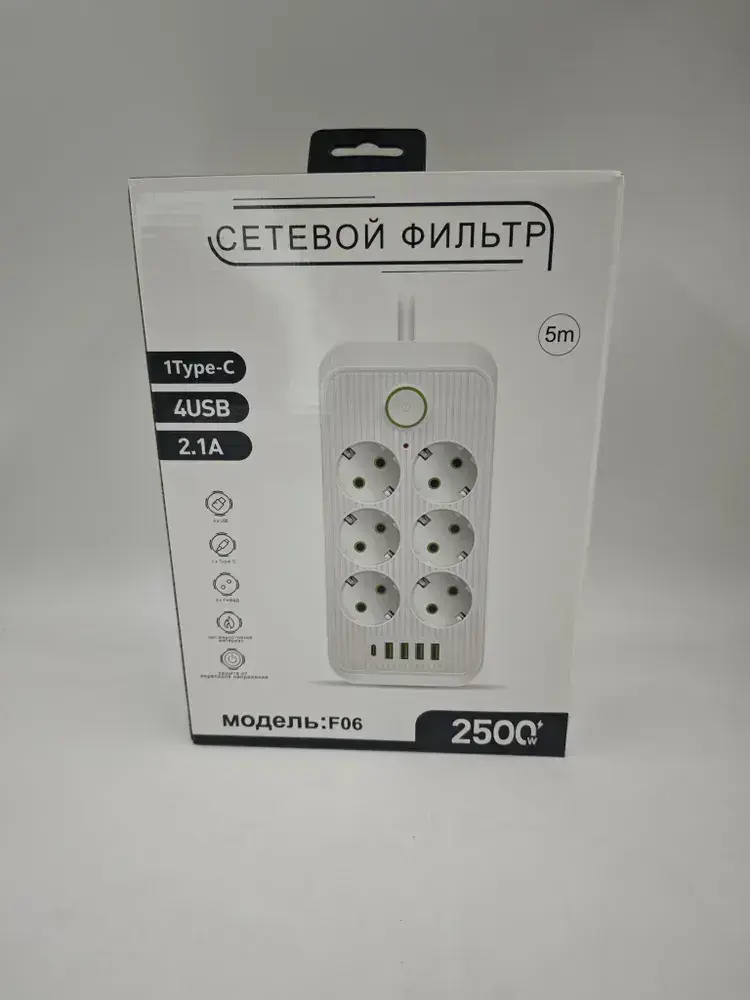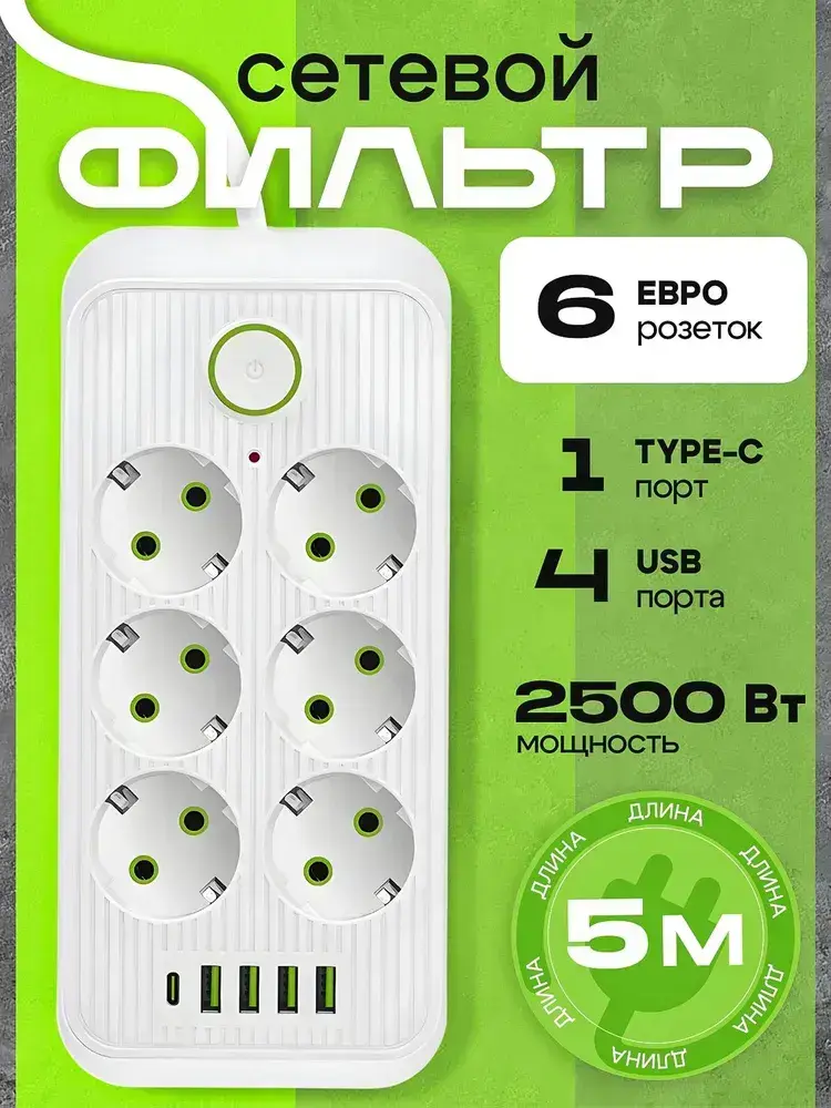 Сетевой фильтр Artdem с предохранителем, удлинитель сетевой 5м, 2500 Вт, 5 метров, 6 розеток