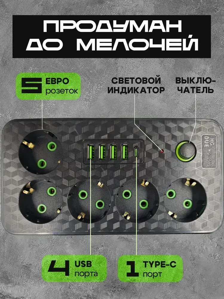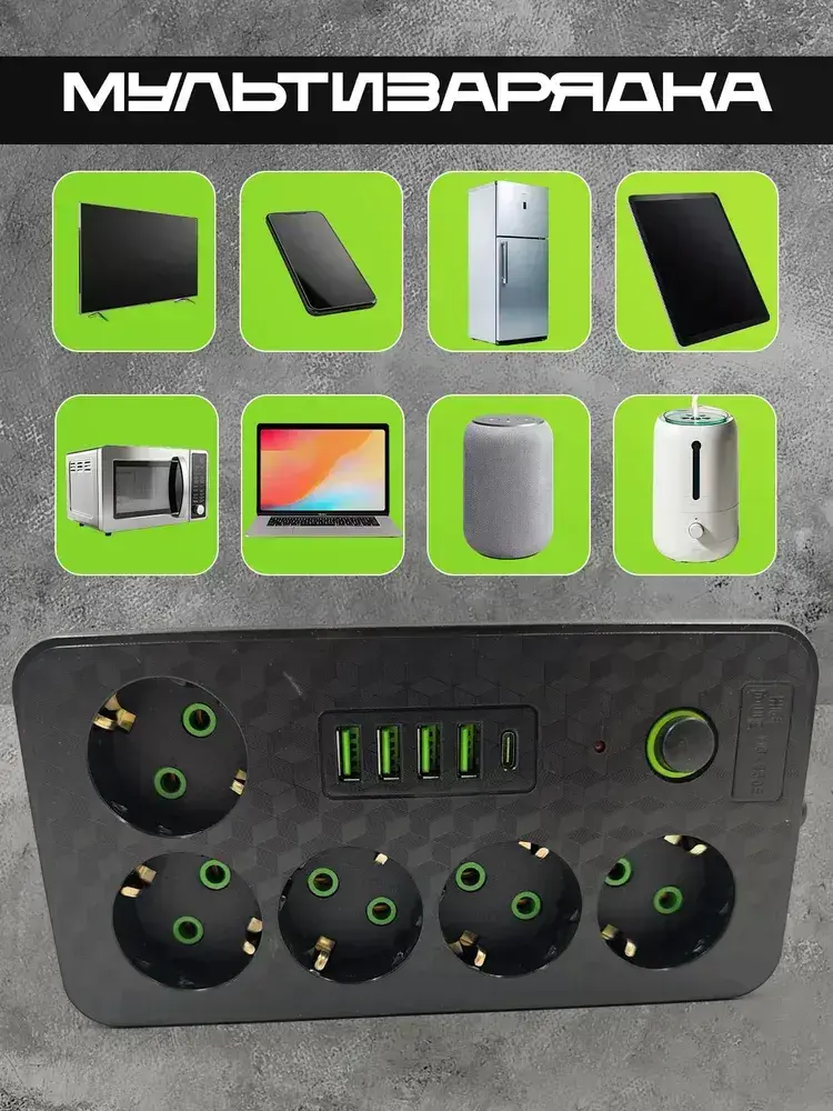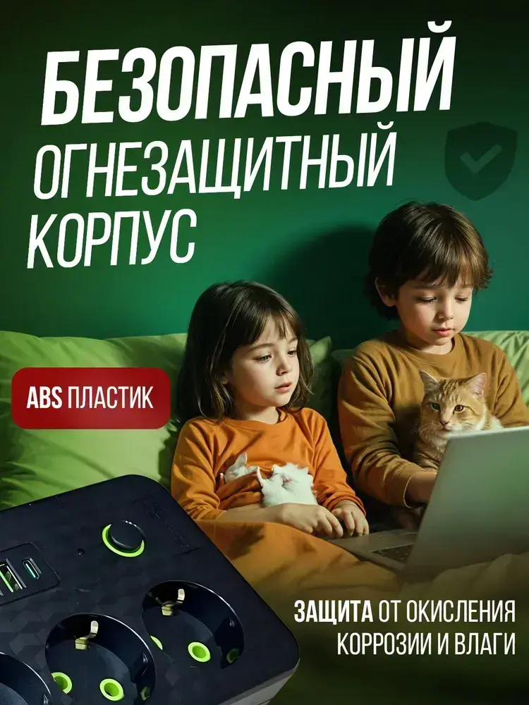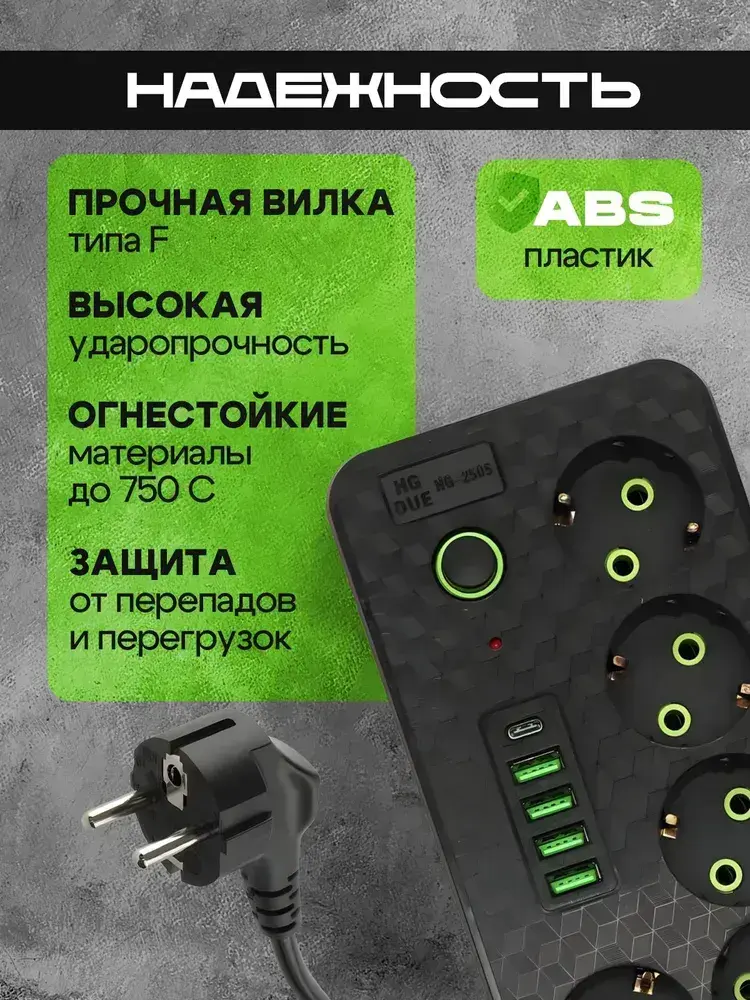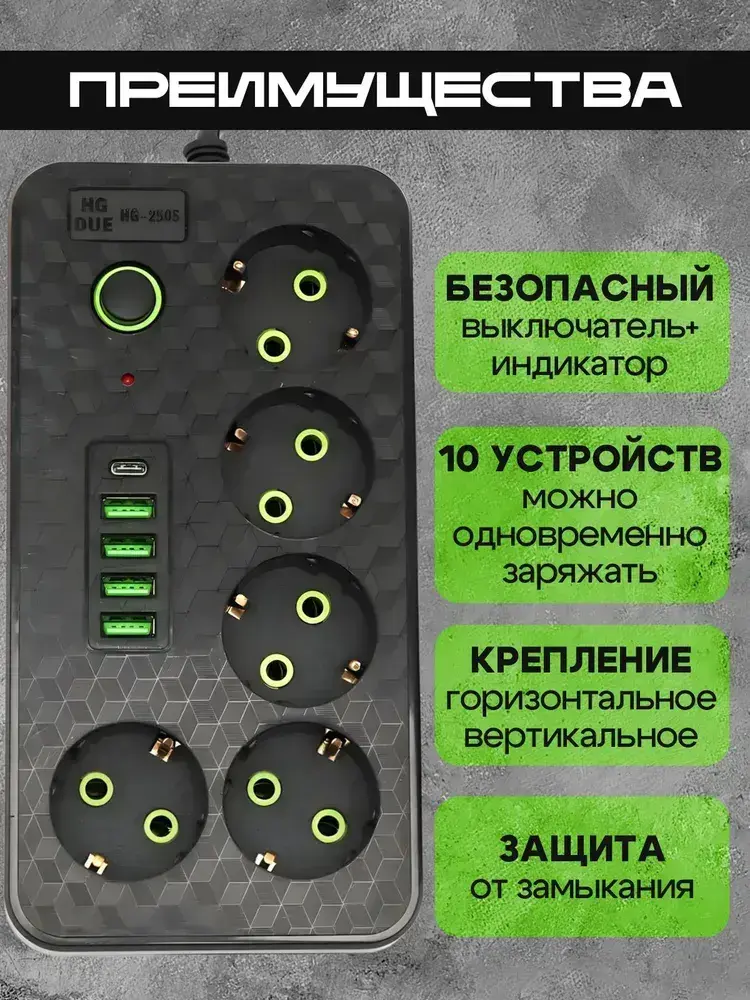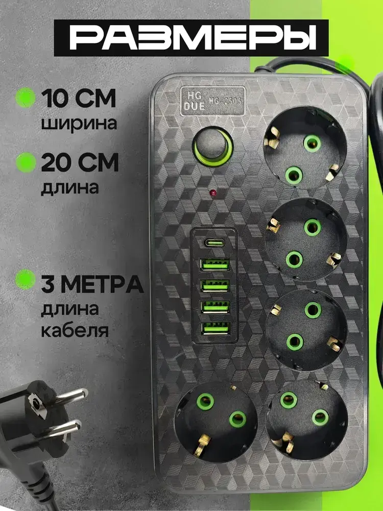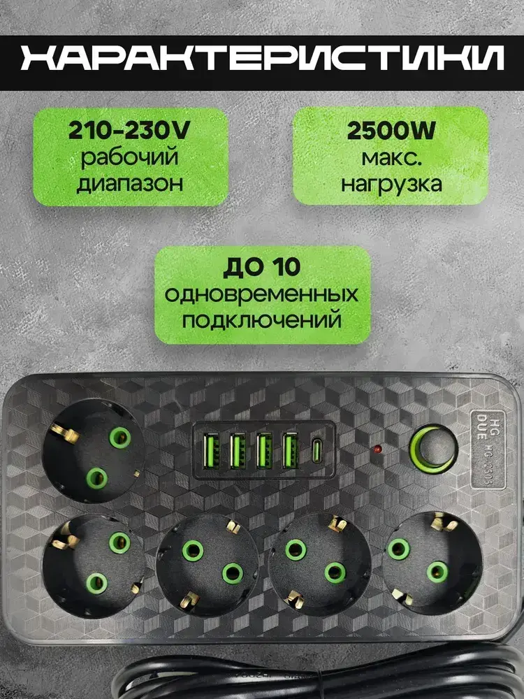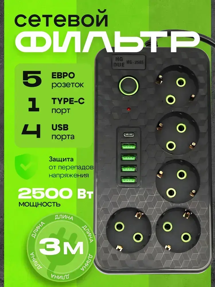 Сетевой фильтр Artdem Удлинитель сетевой фильтр 2500 Вт 3 метра 5 розеток 4 USB 1 Type-C (тройник для розетки, пилот), с предохранителем, с единым выключателем