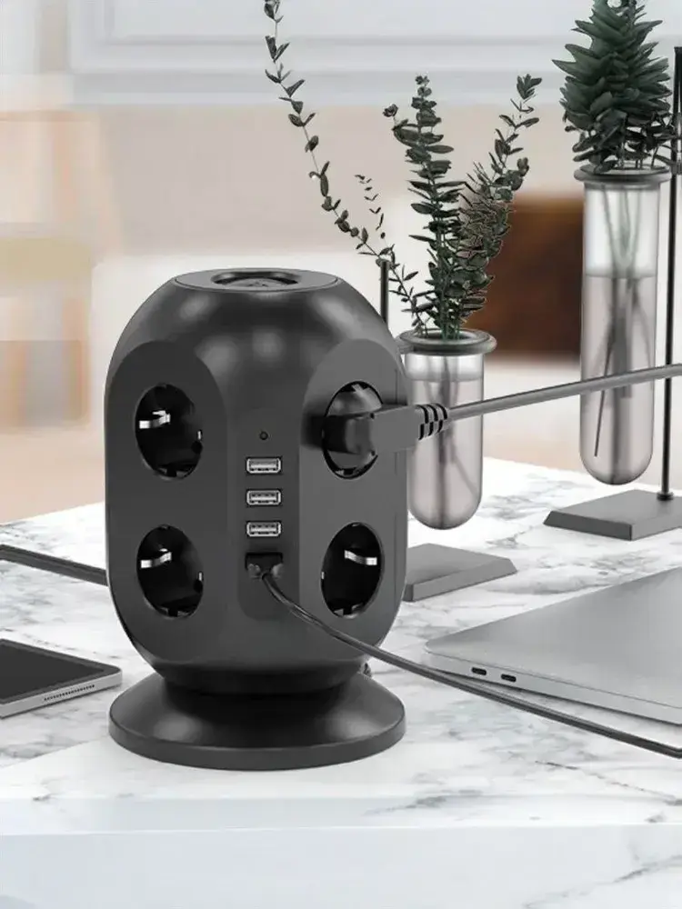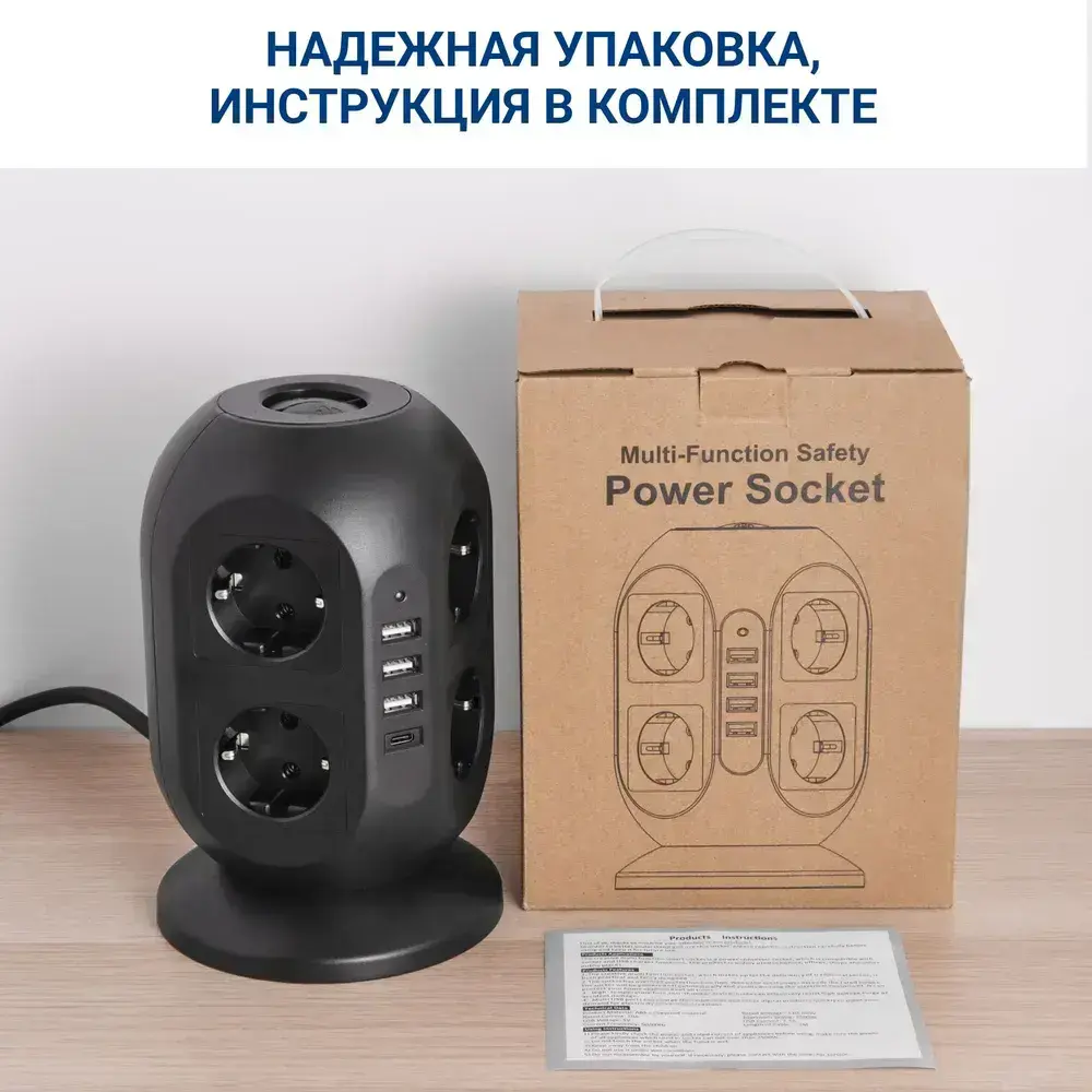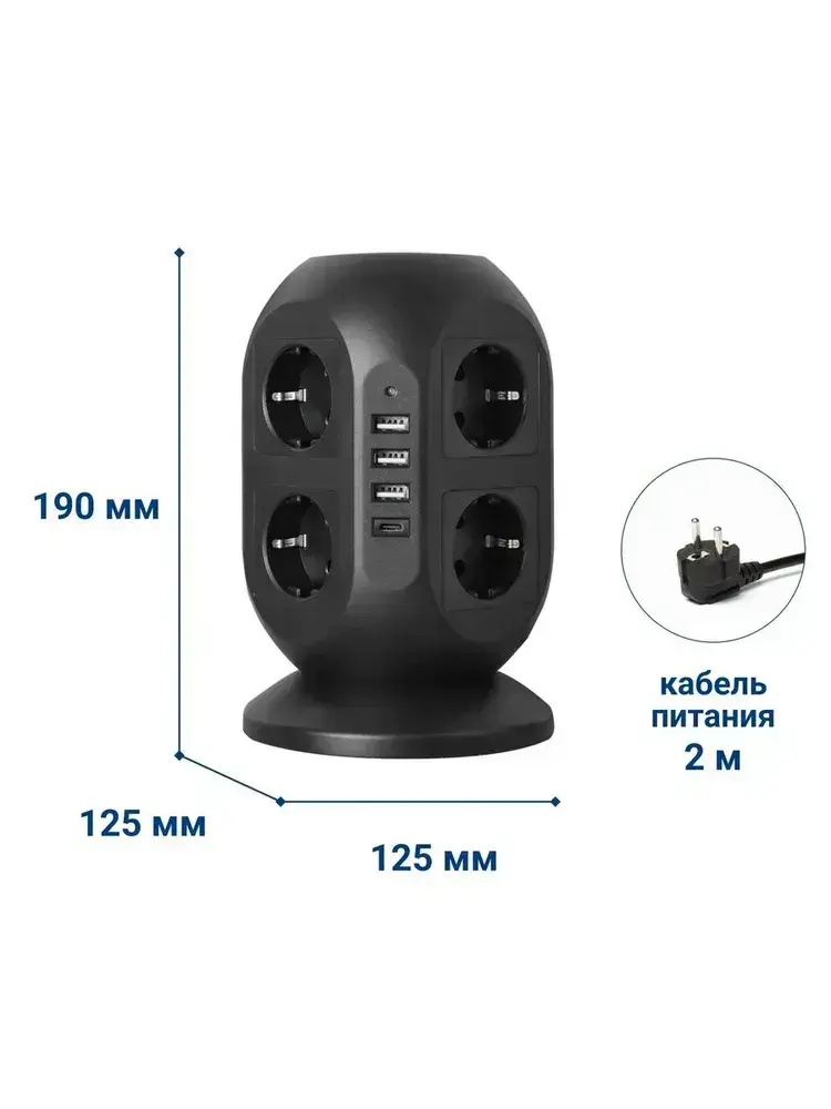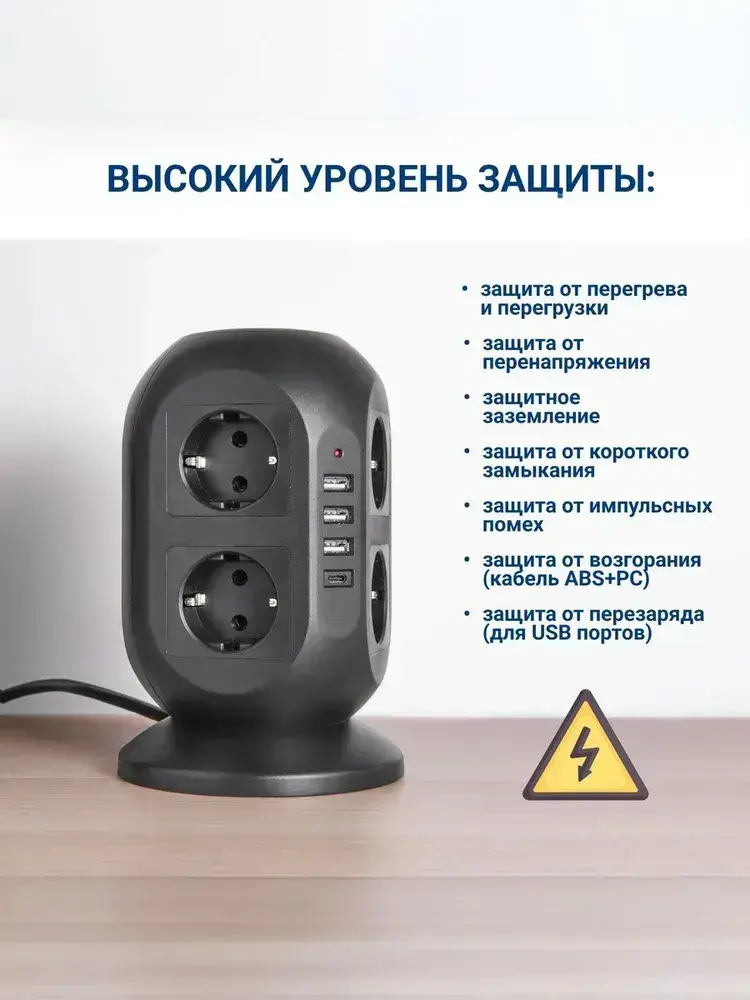 Сетевой фильтр Башня, 8 розеток с предохранителем, 3 USB и 1 Type-C умная зарядка, кабель 3м, заземление