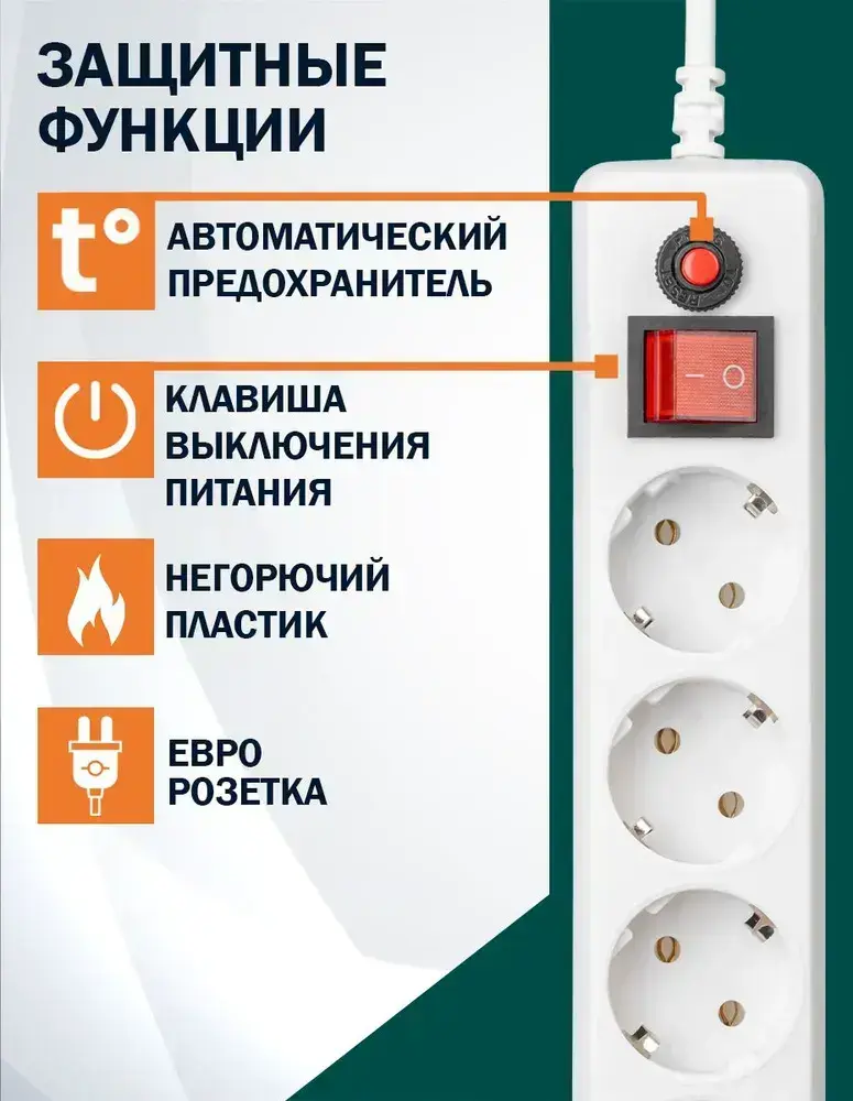 Сетевой фильтр Filum, удлинитель, 3 метра, 5 розеток, белый, предохранитель, с заземлением