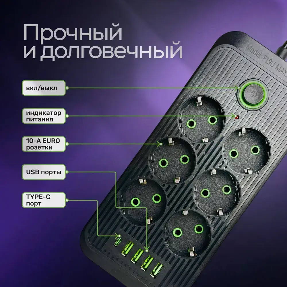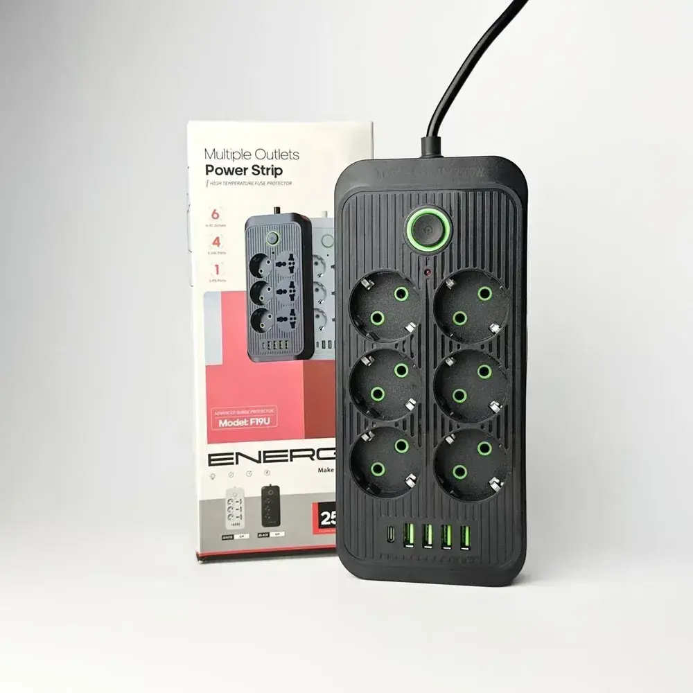 Сетевой фильтр, Гибридный удлинитель 2500 Вт 6 розеток 5 метров 4 USB 1 Type-C (тройник для розетки) с предохранителем, с единым выключателем