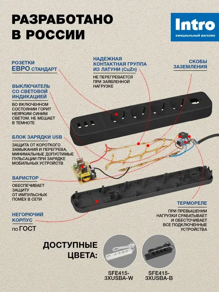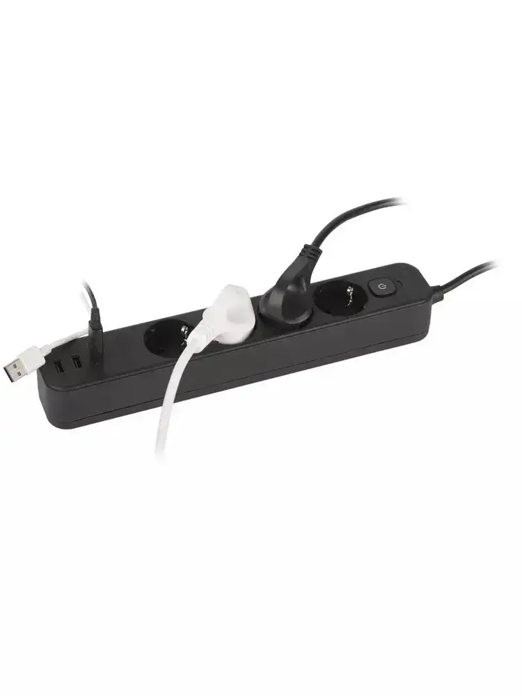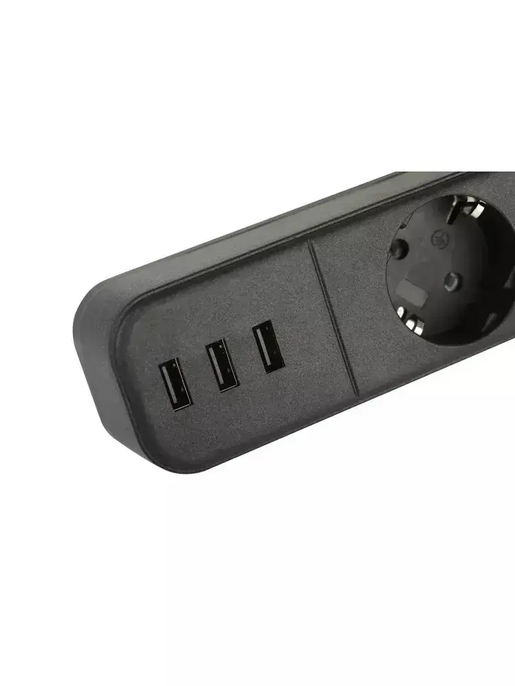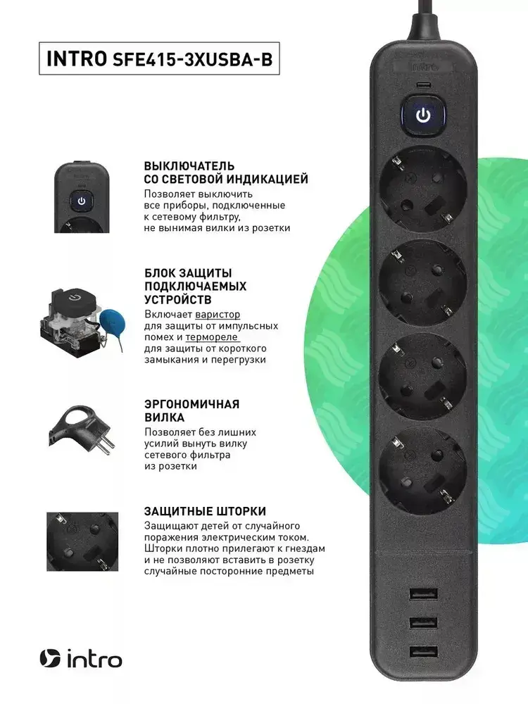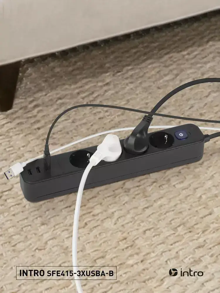 Сетевой фильтр Intro SFE415-3xUSBA-B с базовой защитой с заземлением с выключателем 4 розетки+3xUSBA 3,3A 1,5м 10А / удлинитель сетевой 1,5м