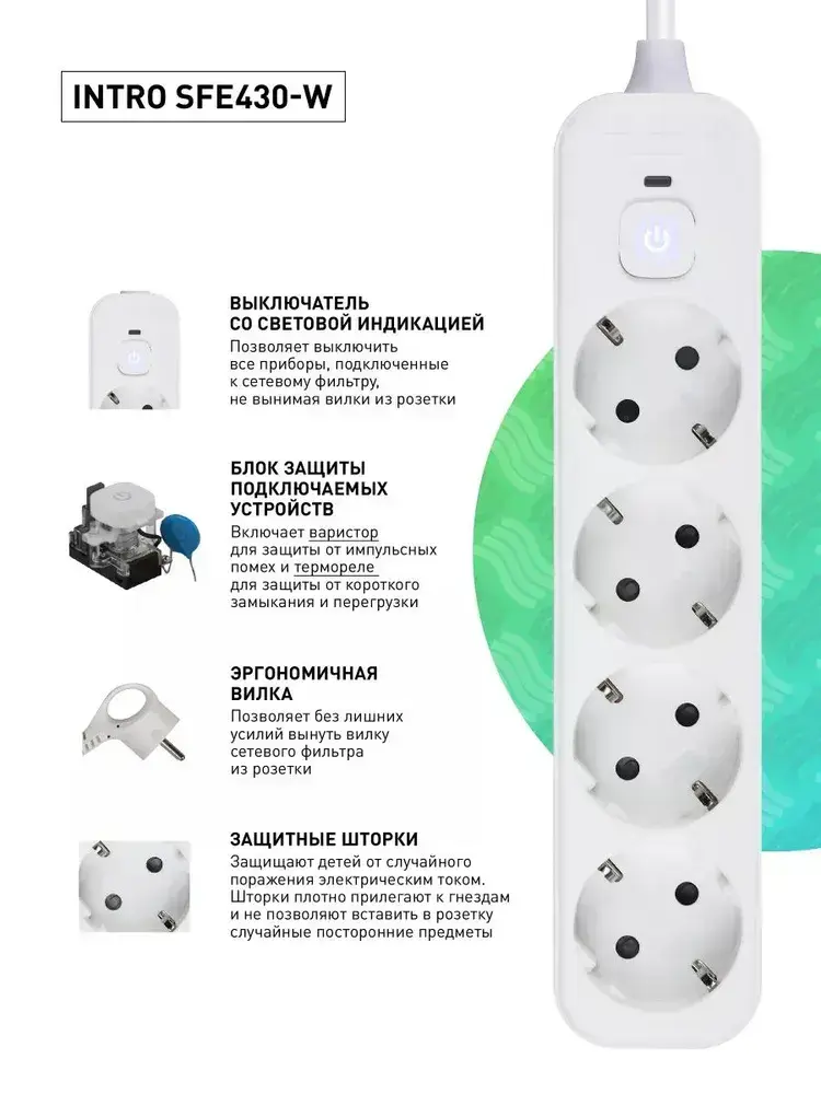 Сетевой фильтр Intro SFE430-W с базовой защитой с заземлением с выключателем 4 розетки 3м 10А белый / удлинитель сетевой 3м