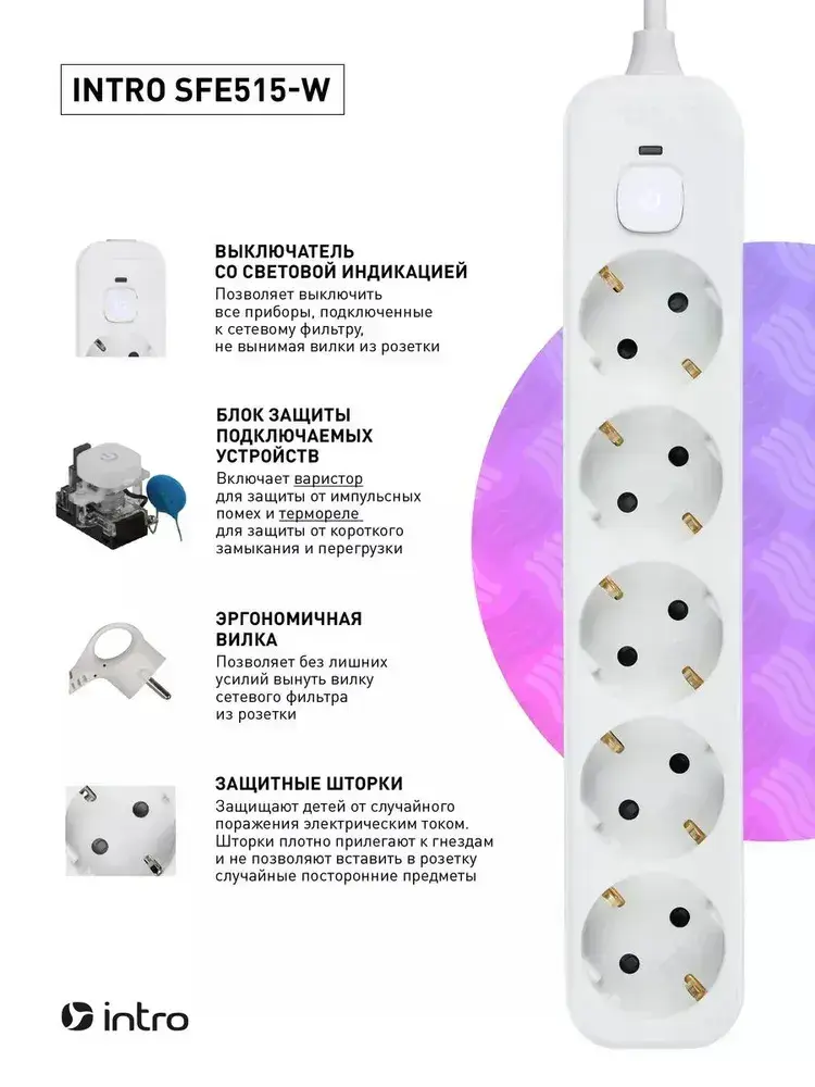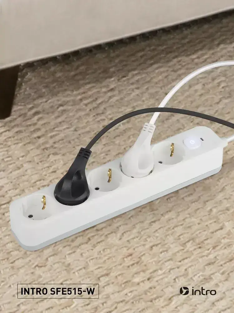 Сетевой фильтр Intro SFE515-W с базовой защитой с заземлением с выключателем 5 розеток 1,5м 10А белый / удлинитель сетевой 1.5м