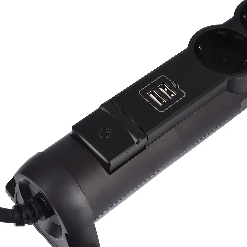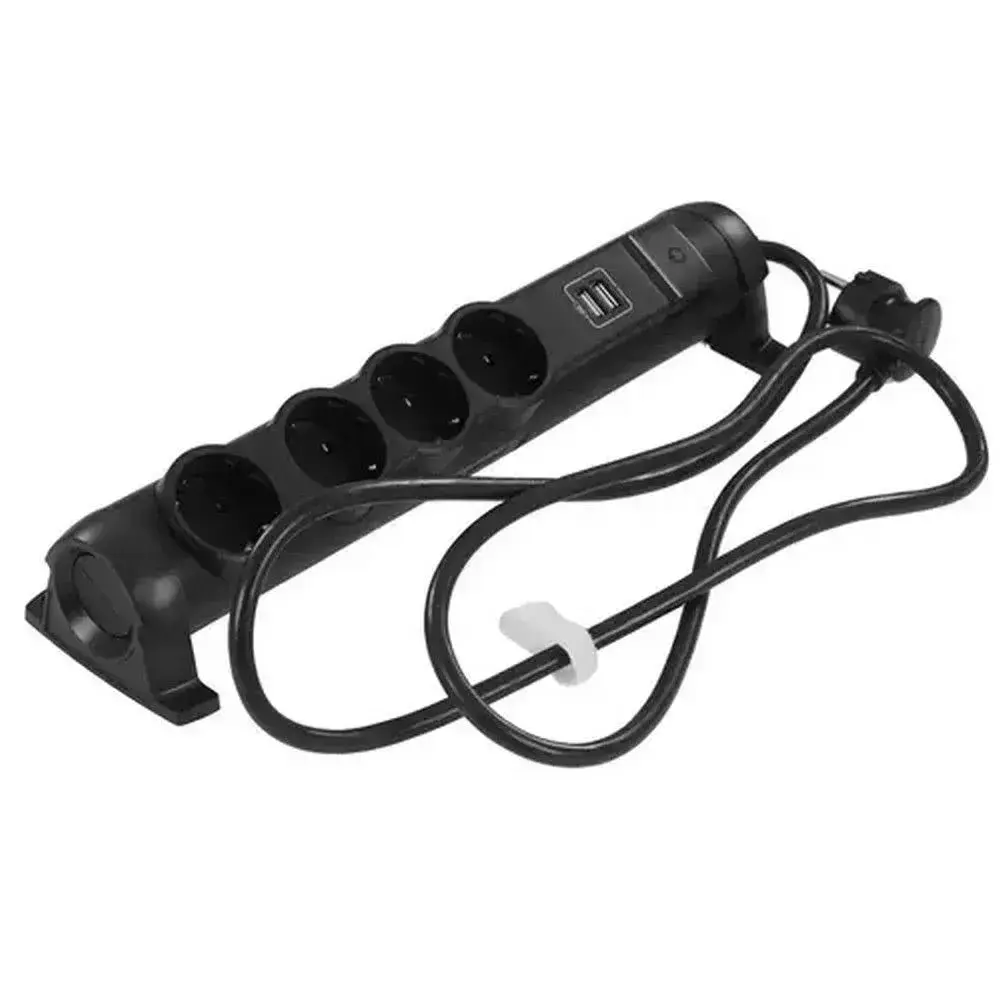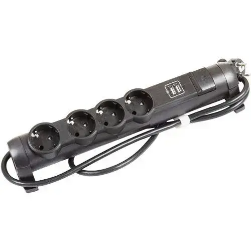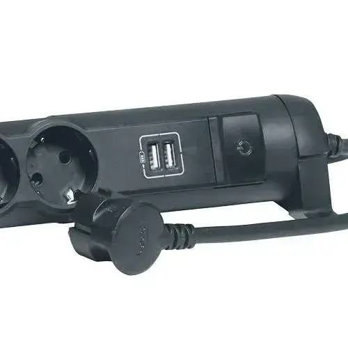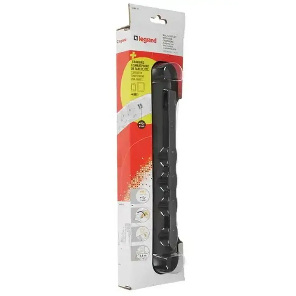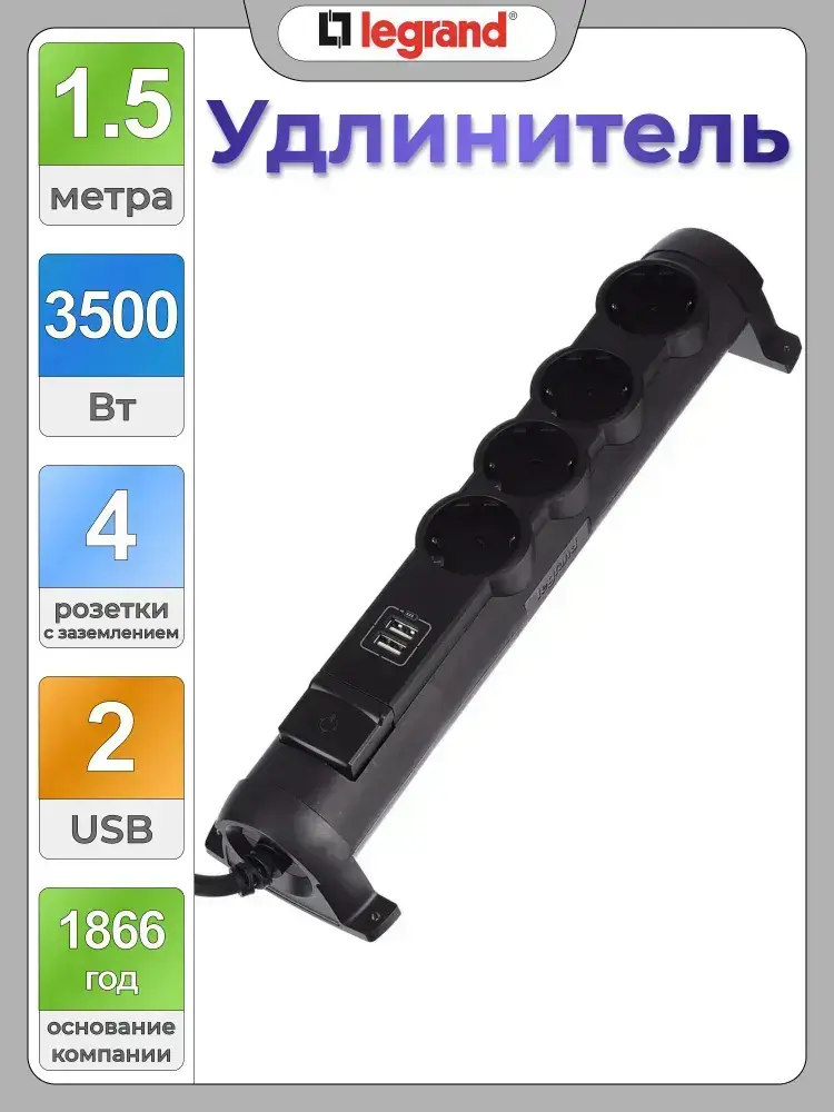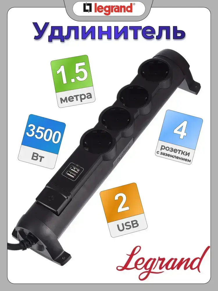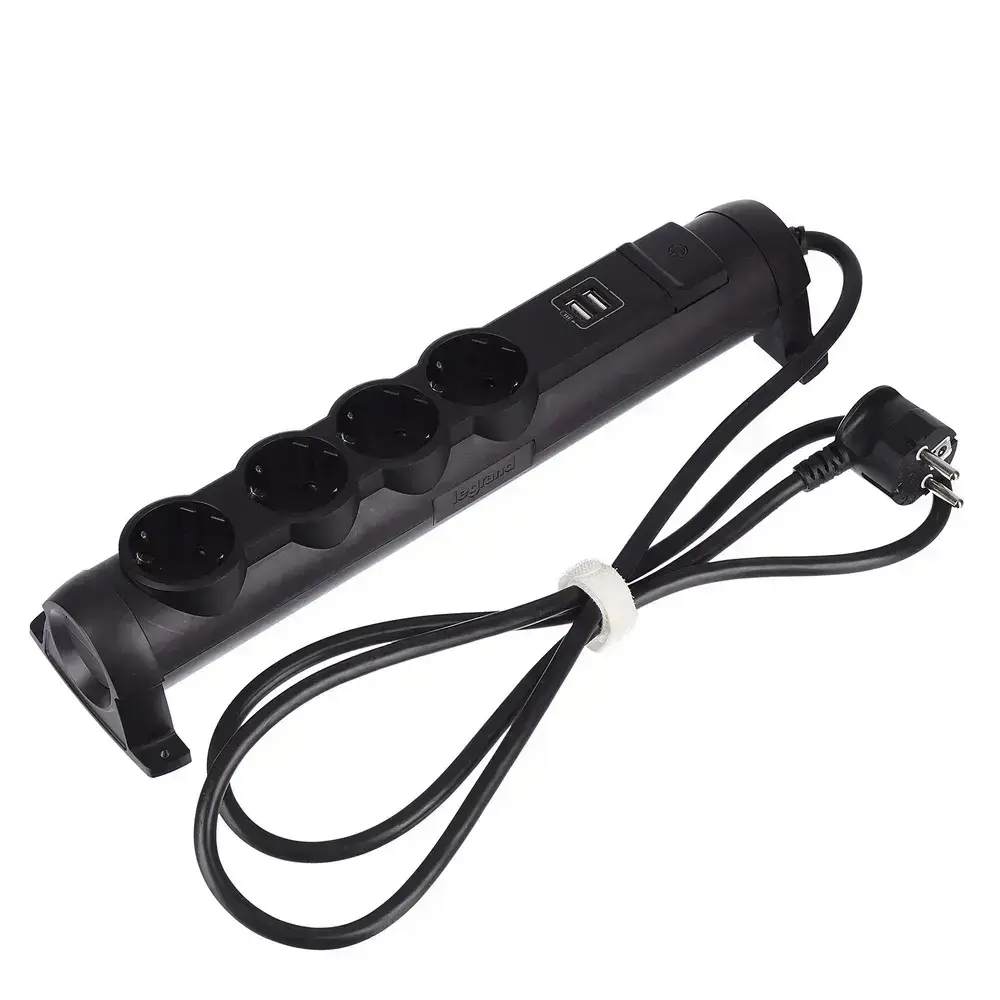 Сетевой фильтр Legrand - 4 розетки с заземлением + USB 2 порта 2.4A, 3500 Вт, черный - 1.5 метра