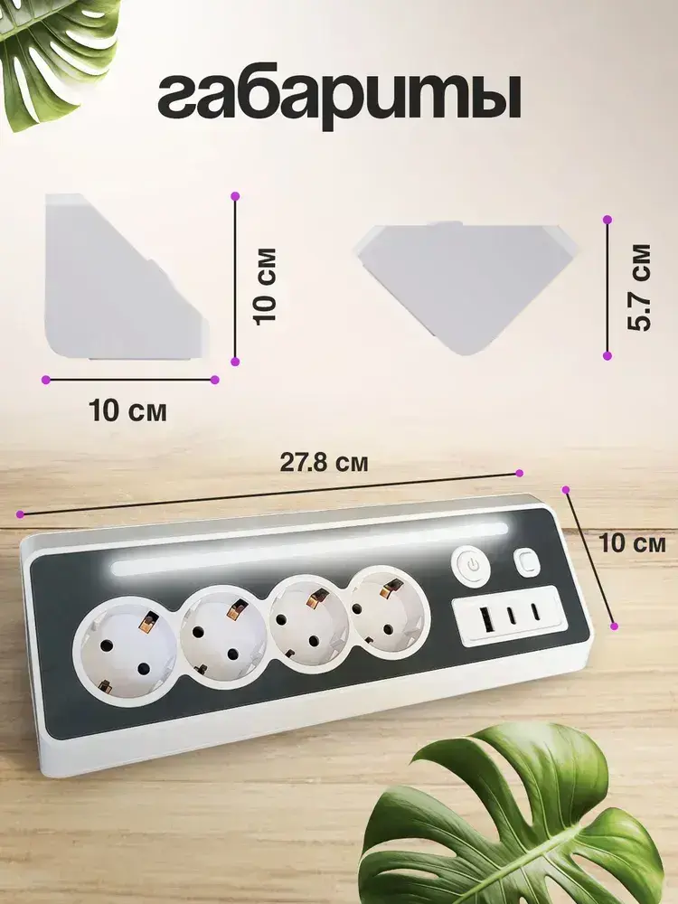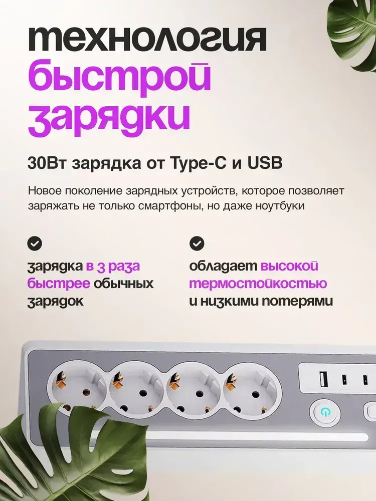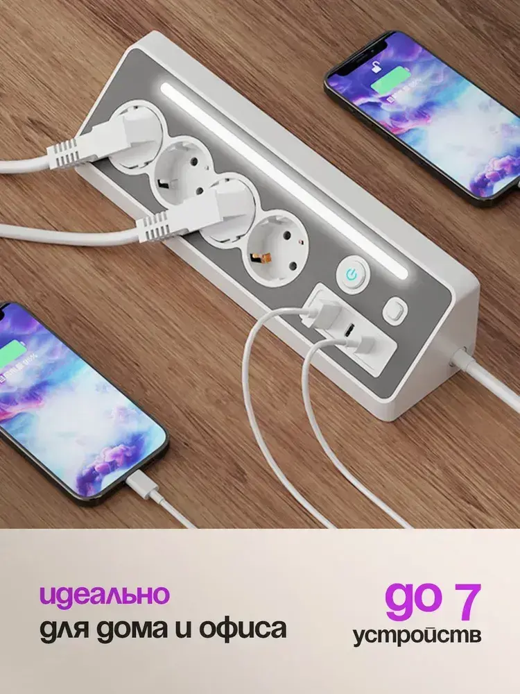 Сетевой фильтр настольный, 4 розетки + 1 USB и 2 TYPE-C быстрая зарядка 30 Вт, кабель 1.5м