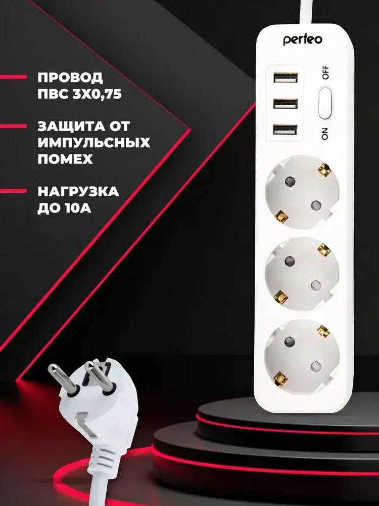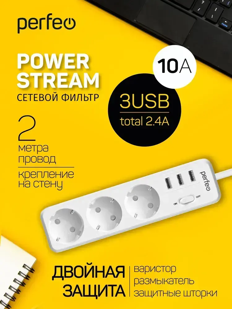 Сетевой фильтр Perfeo "POWER STREAM", 2500W, двойная защита, 2м, 3 розетки, 3 USB, белый.