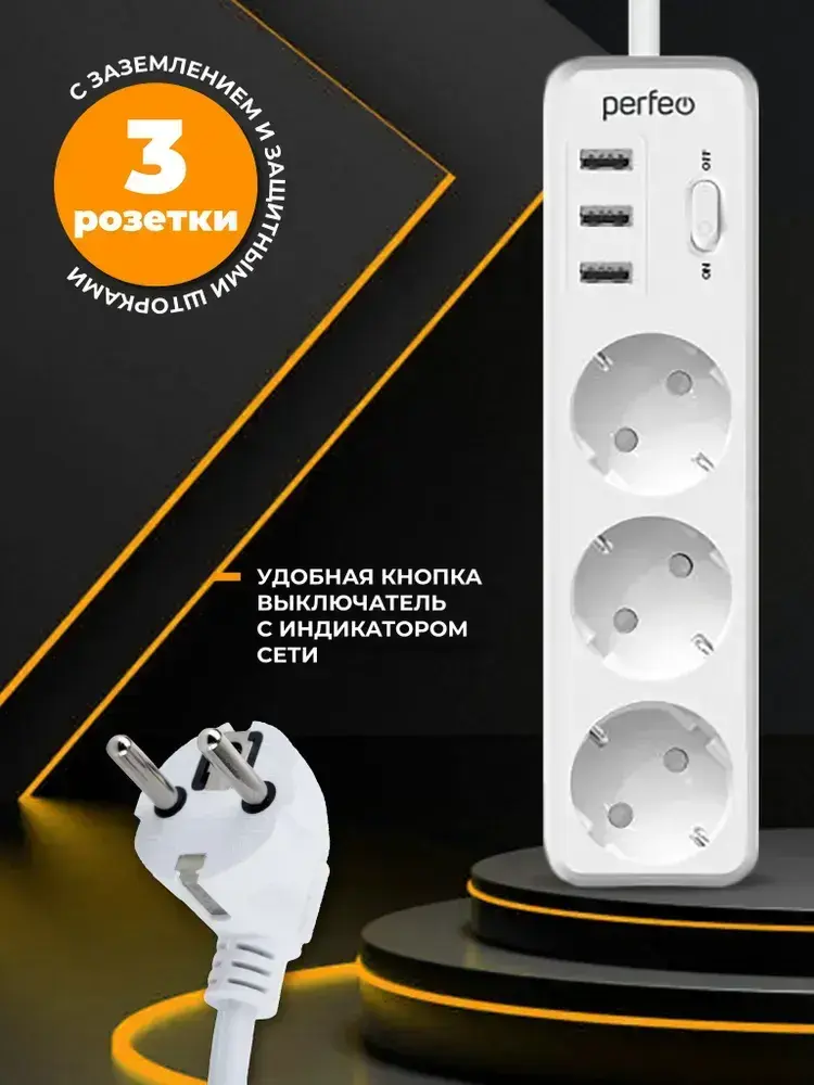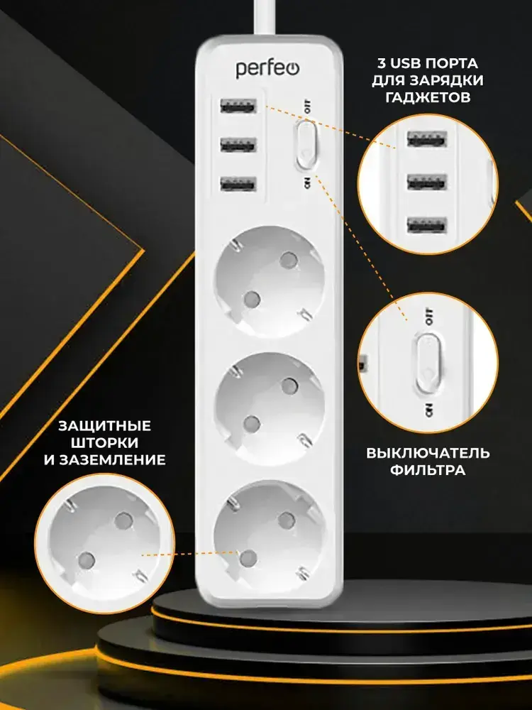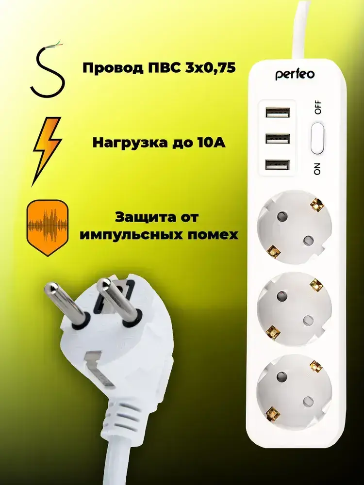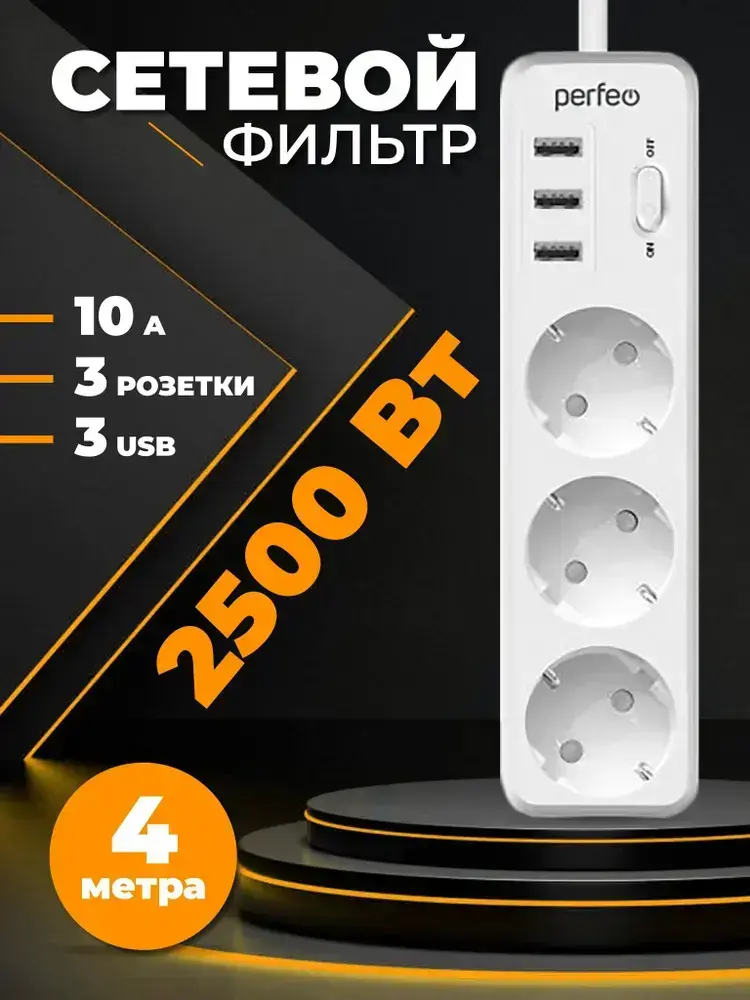 Сетевой фильтр Perfeo "POWER STREAM", 2500W, двойная защита, 4м, 3 розетки, 3 USB, белый.