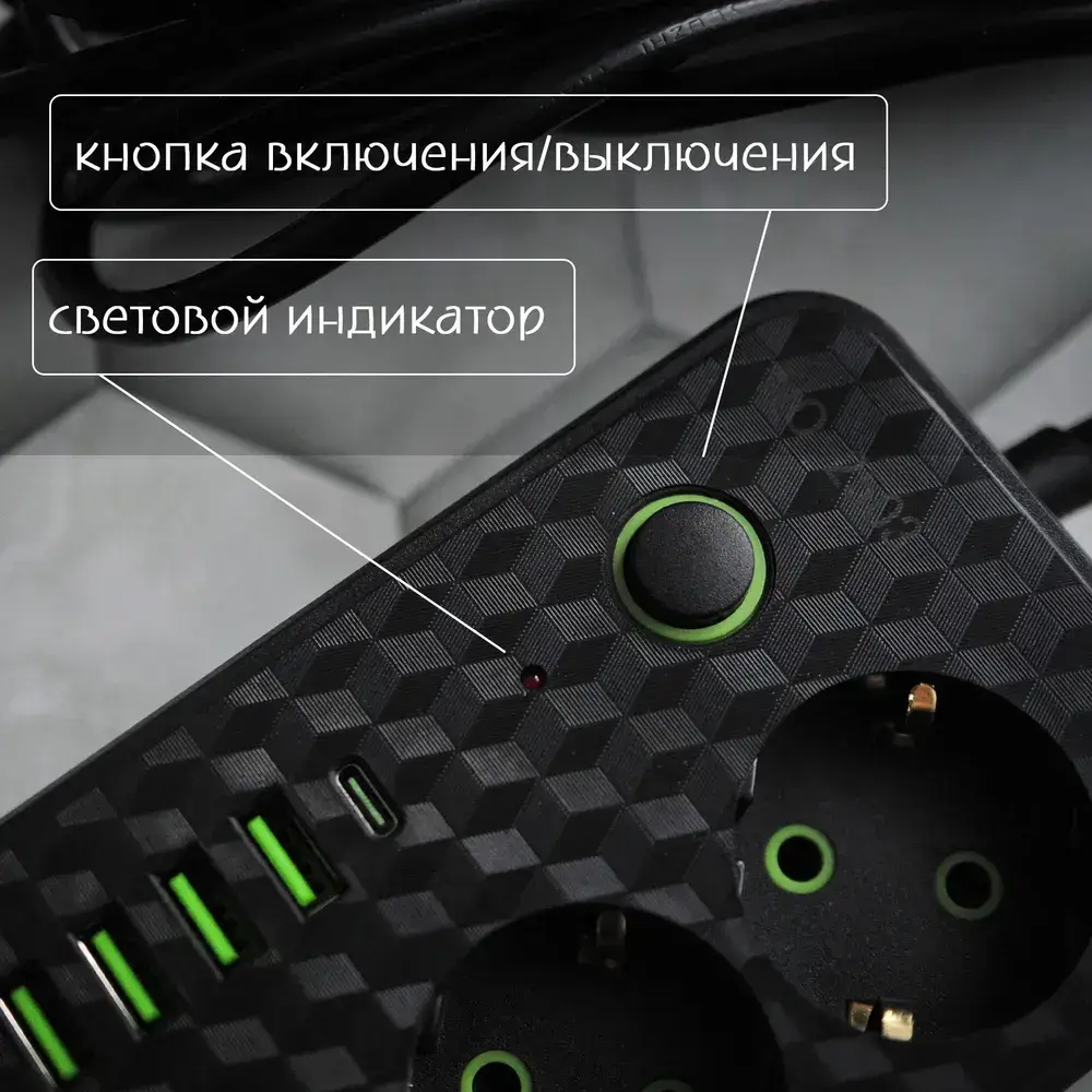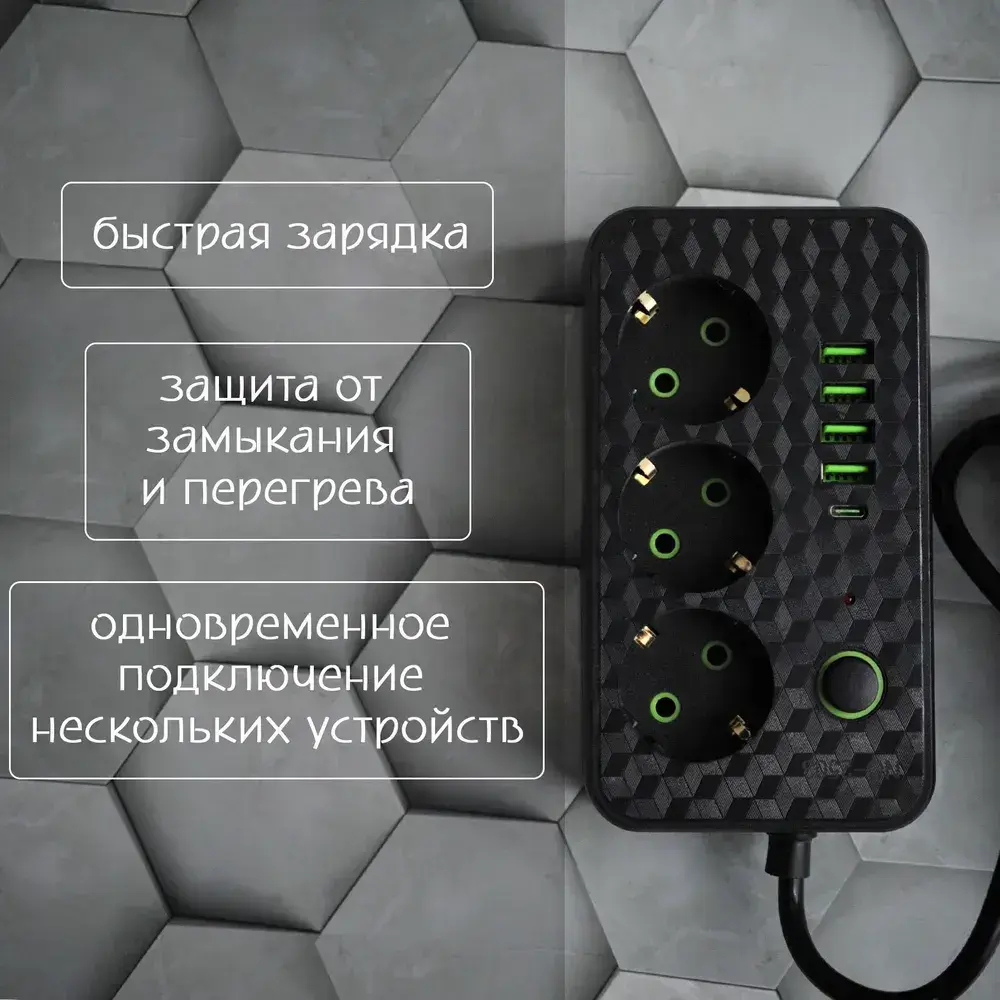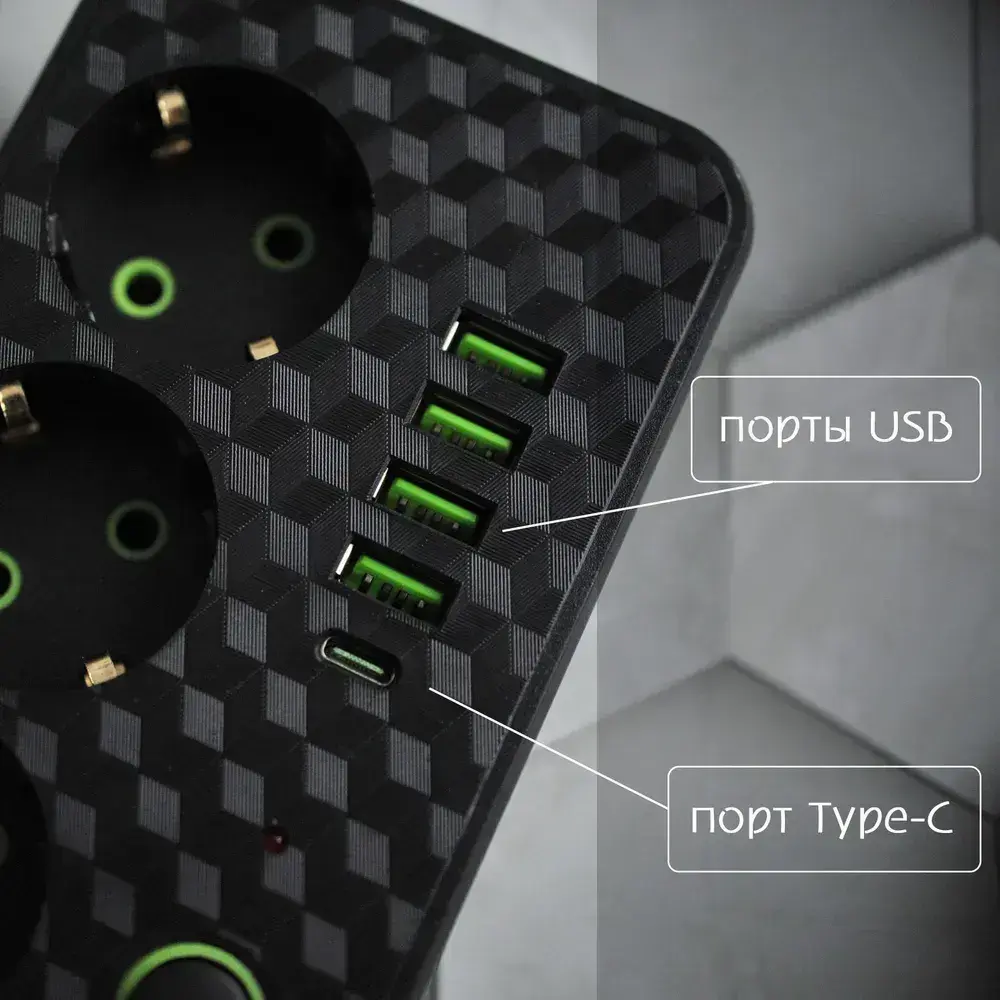Сетевой фильтр с 2 USB-портами, 1 Type-C,3 розетки