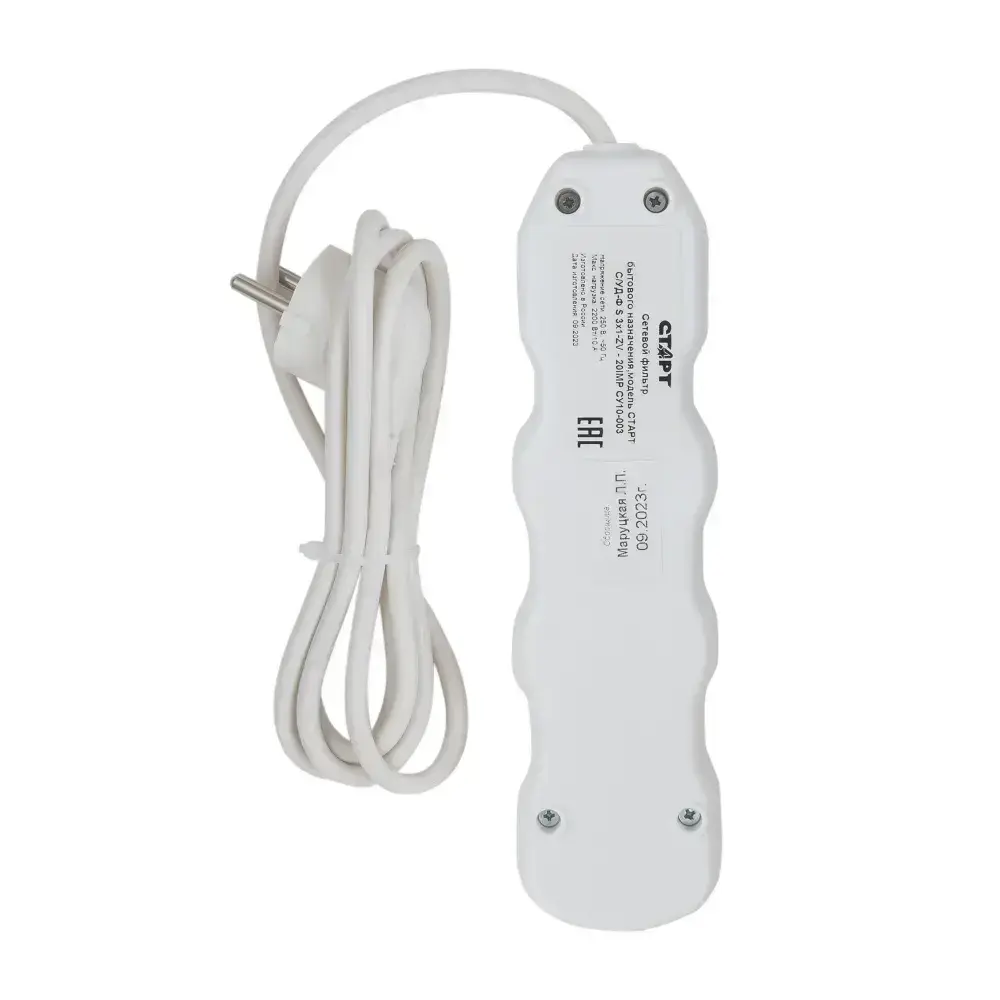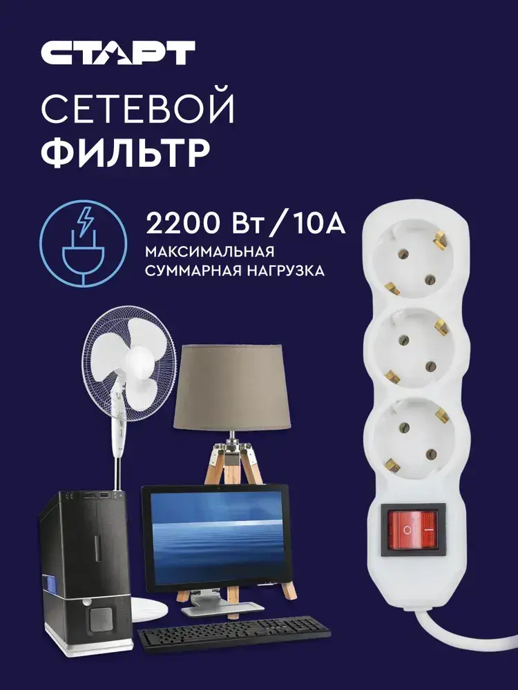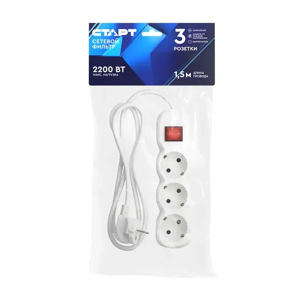 Сетевой фильтр с предохранителем 1.5м 3 розетки СТАРТ удлинитель бытовой с заземлением, защита от скачков напряжения