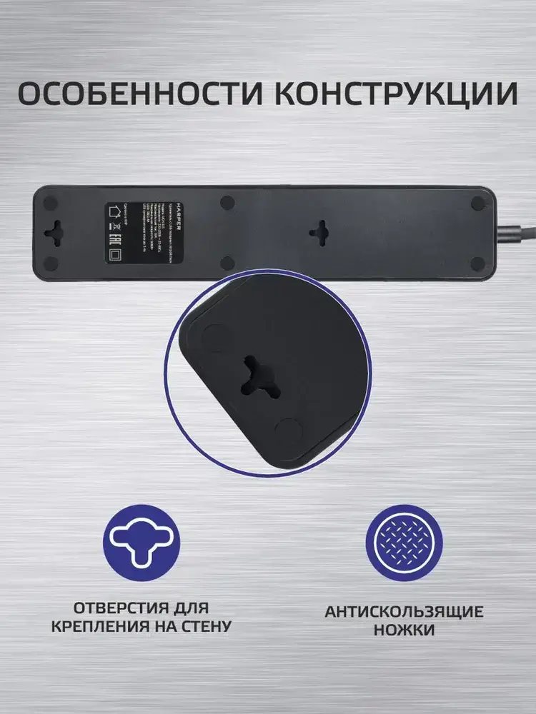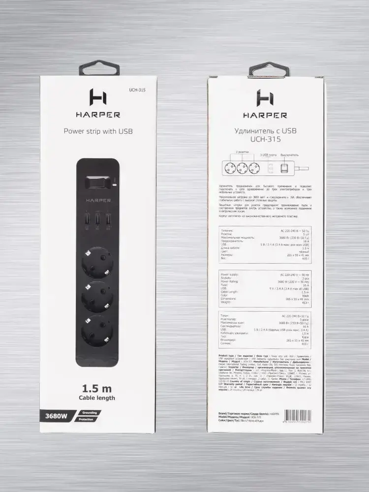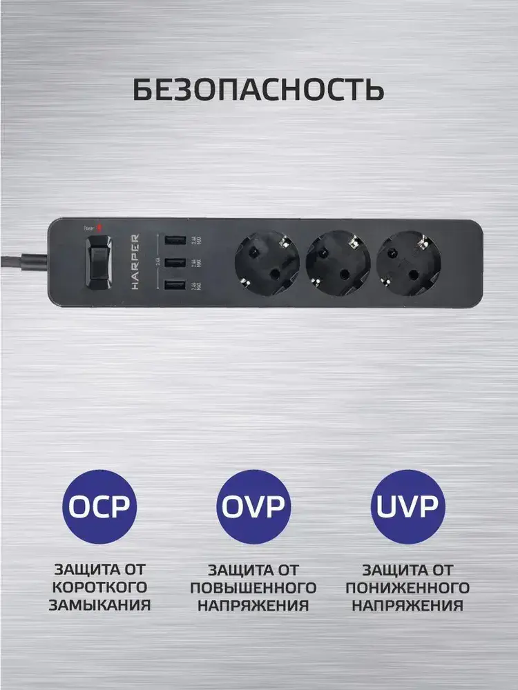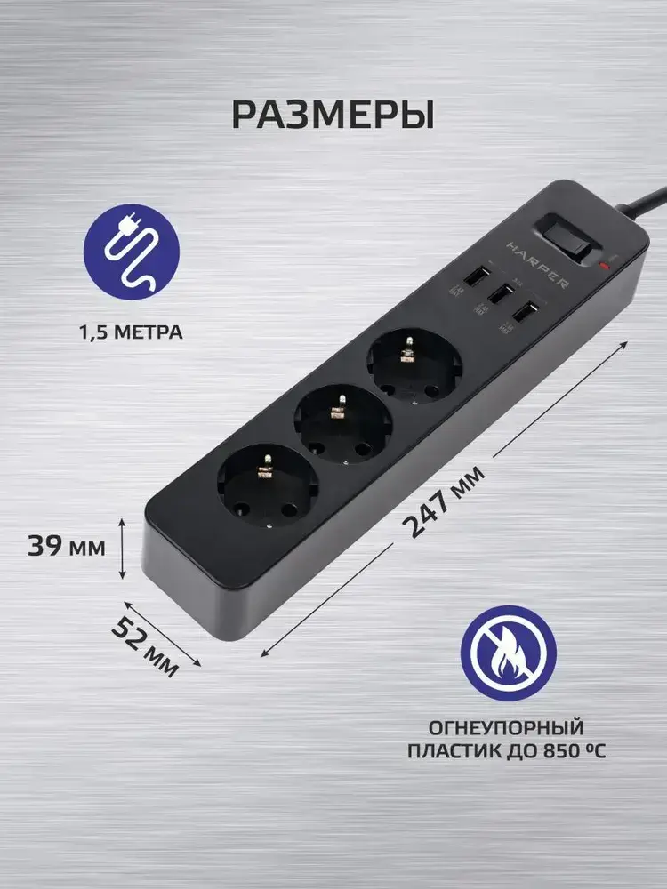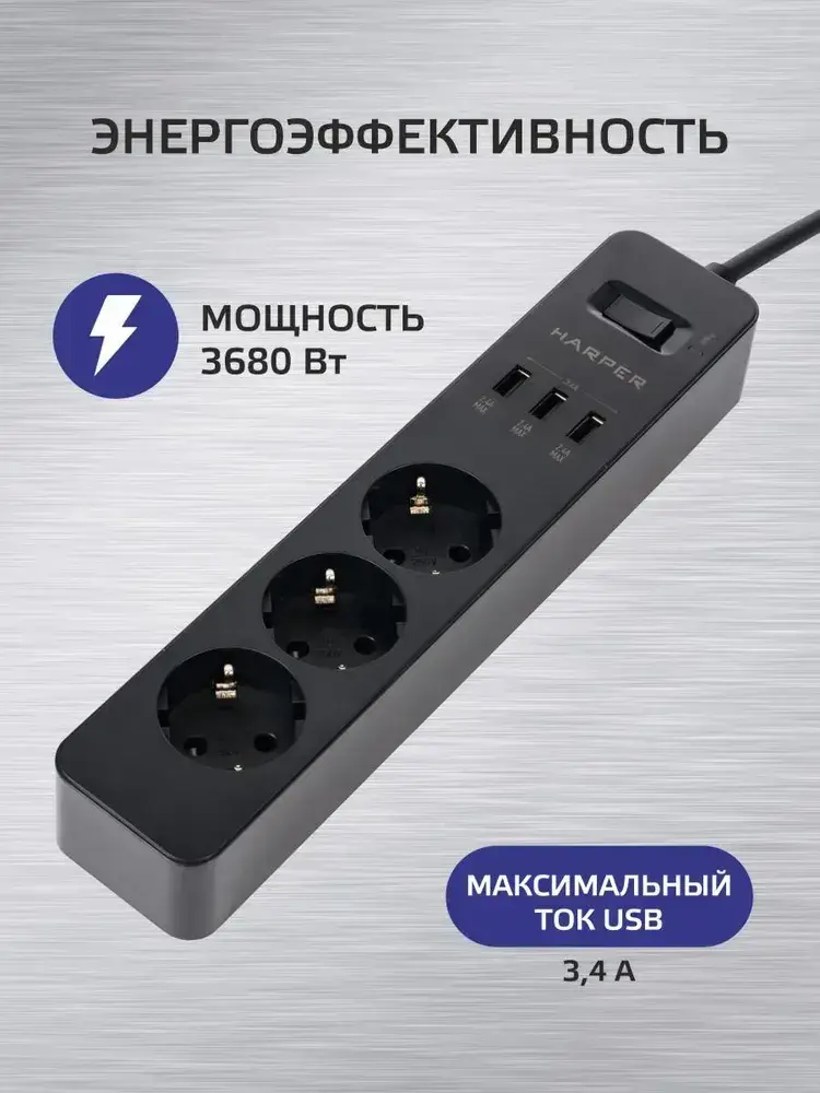 Сетевой фильтр с предохранителем HARPER UCH-315, 3 розетки, 3 USB, кабель 1.5 метра, 3680 Вт, 16А, черный