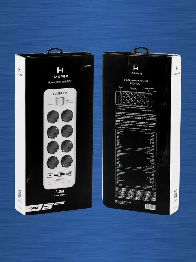 Сетевой фильтр с предохранителем HARPER UCH-650, 8 розеток, 3 USB + 1 type-C с поддержкой power delivery, кабель 5 метров, 4000 Вт, 16А, белый