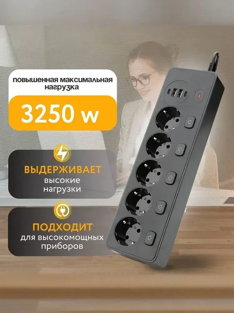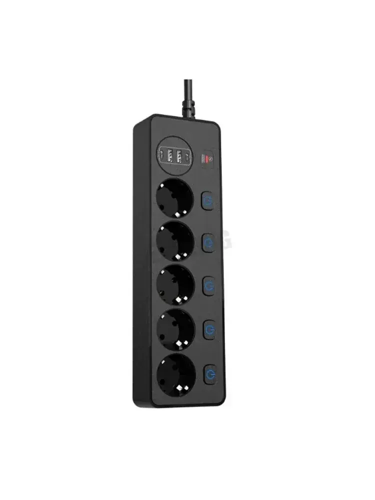 Сетевой фильтр с предохранителем и заземлением, 5 розетки + 2 USB / 2 TYPE-C, кабель 2м