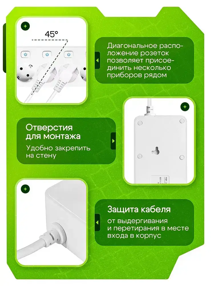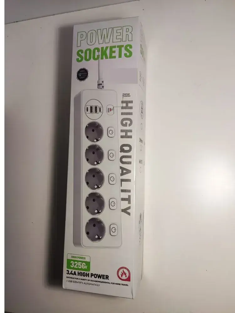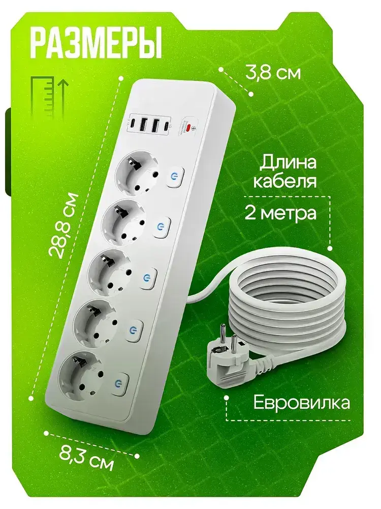 Сетевой фильтр с предохранителем с USB/TYPE-C, 5 розеток, 3,25кВт, провод 2м с заземлением