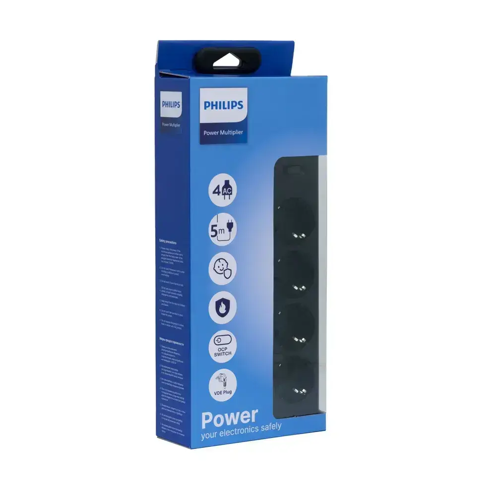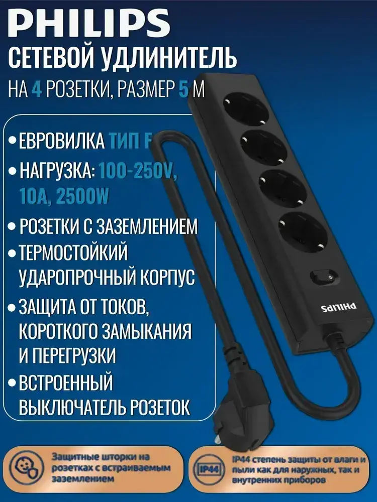 Сетевой фильтр удлинитель Philips CHP2145BC/51 с четырьмя стандартными розетками EU, с заземлением и защитой от перегрузок, 5 м, черный