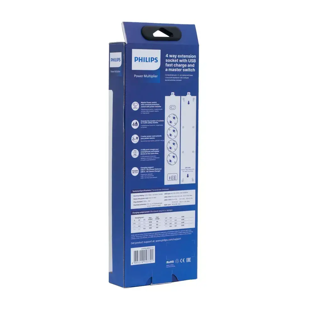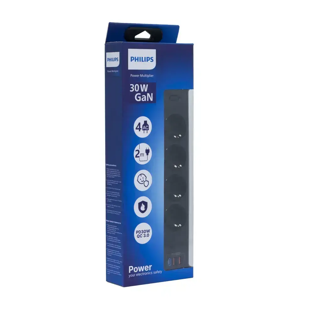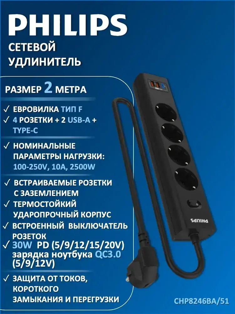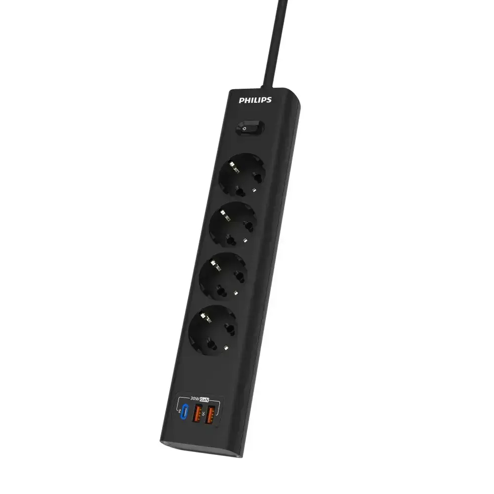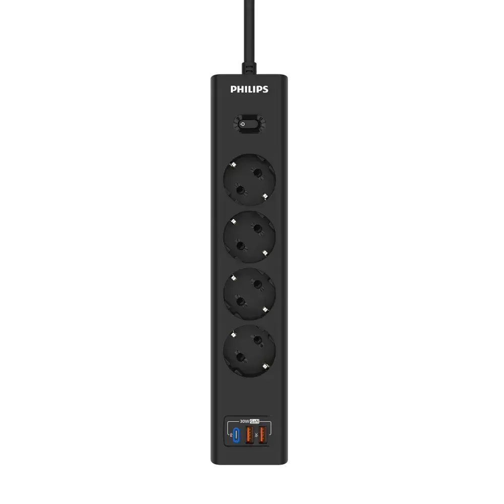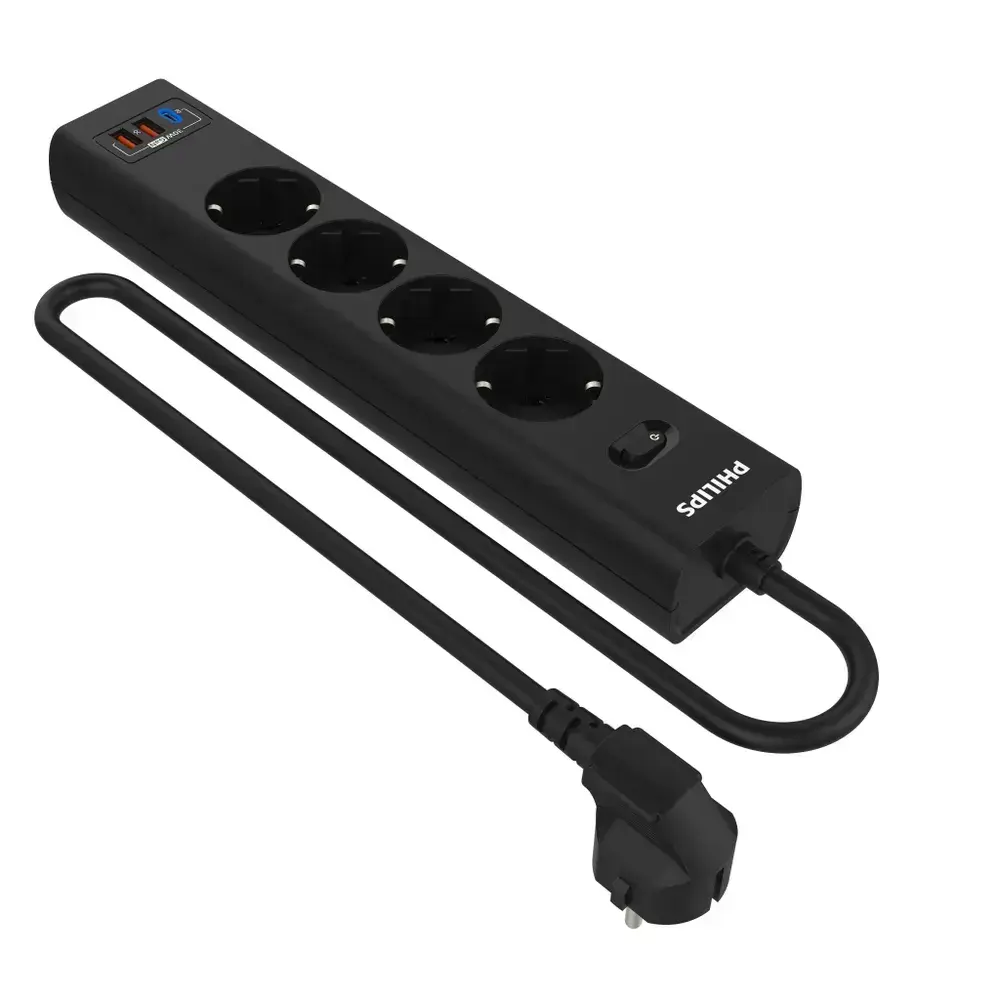 Сетевой фильтр удлинитель Philips CHP8246BA/51 с четырьмя стандартными розетками EU, 2 USB-A, Type-C, с заземлением и защитой от перегрузок, 2 м, черный